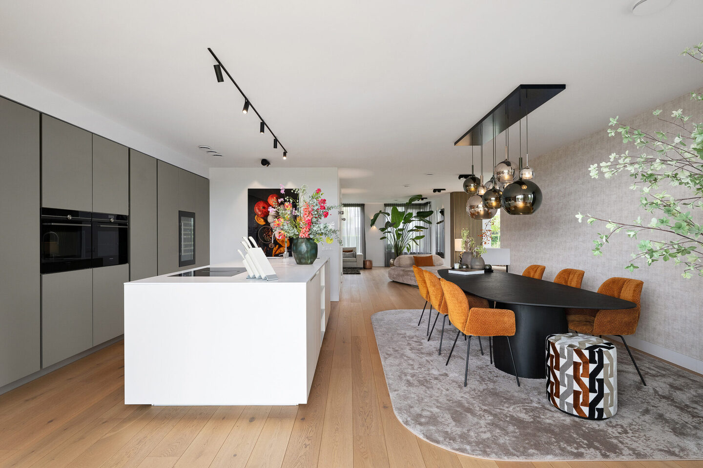 De woonkamer en keuken vormen één open, ruimtelijk geheel. De moderne Poliform-keuken is luxe uitgevoerd en voorzien van hoogwaardige inbouwapparatuur, waaronder koel- en vrieskasten, stoomoven, combi-oven/magnetron, een inductiekookplaat met geïntegreerde afzuiging, vaatwasser, dubbele spoelbakken en een wijnklimaatkast. Het centrale kookeiland maakt dit tot een echte leefkeuken.