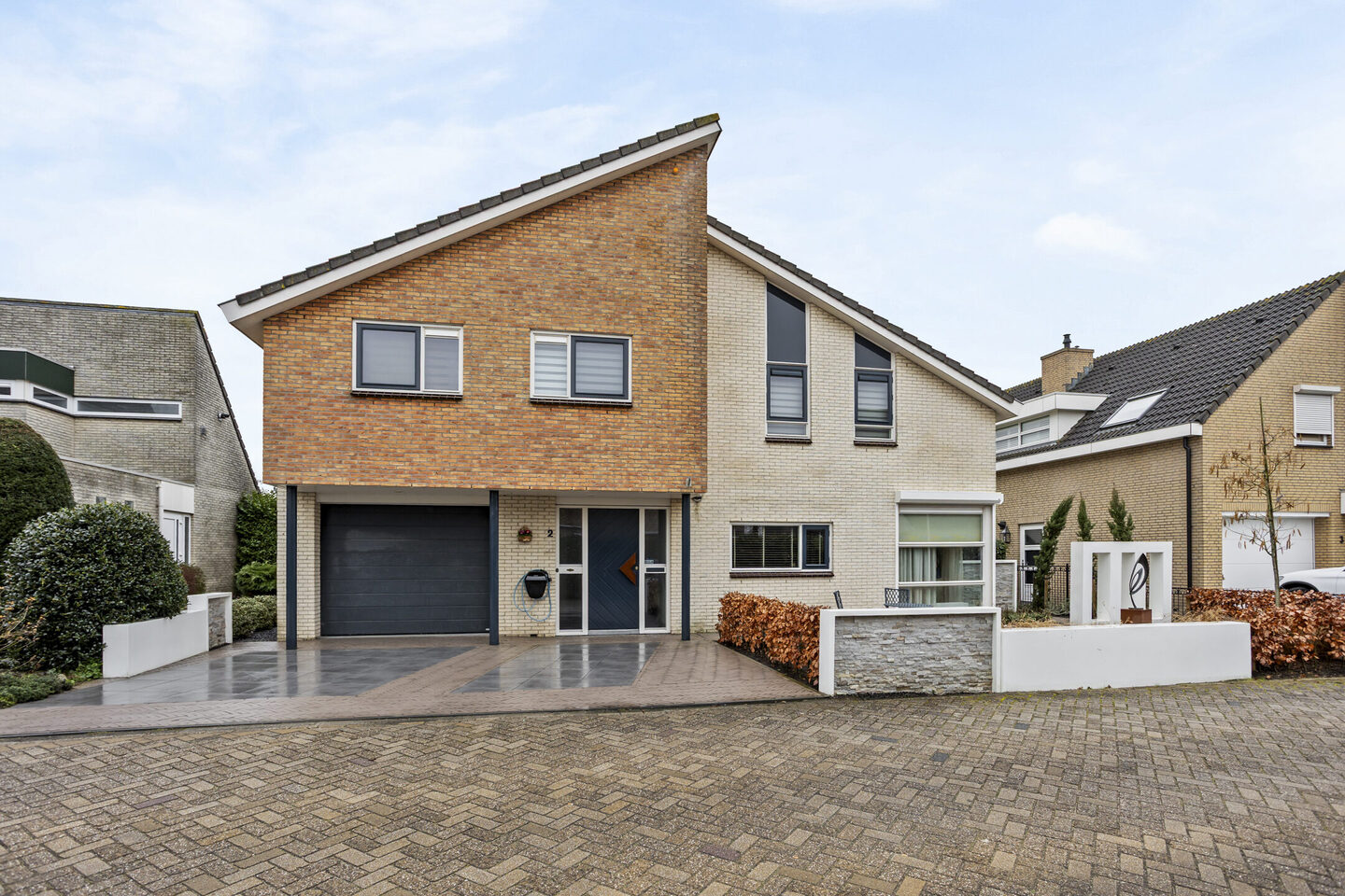 Nette voortuin met eigen oprit, toegang tot de garage en zij-om.