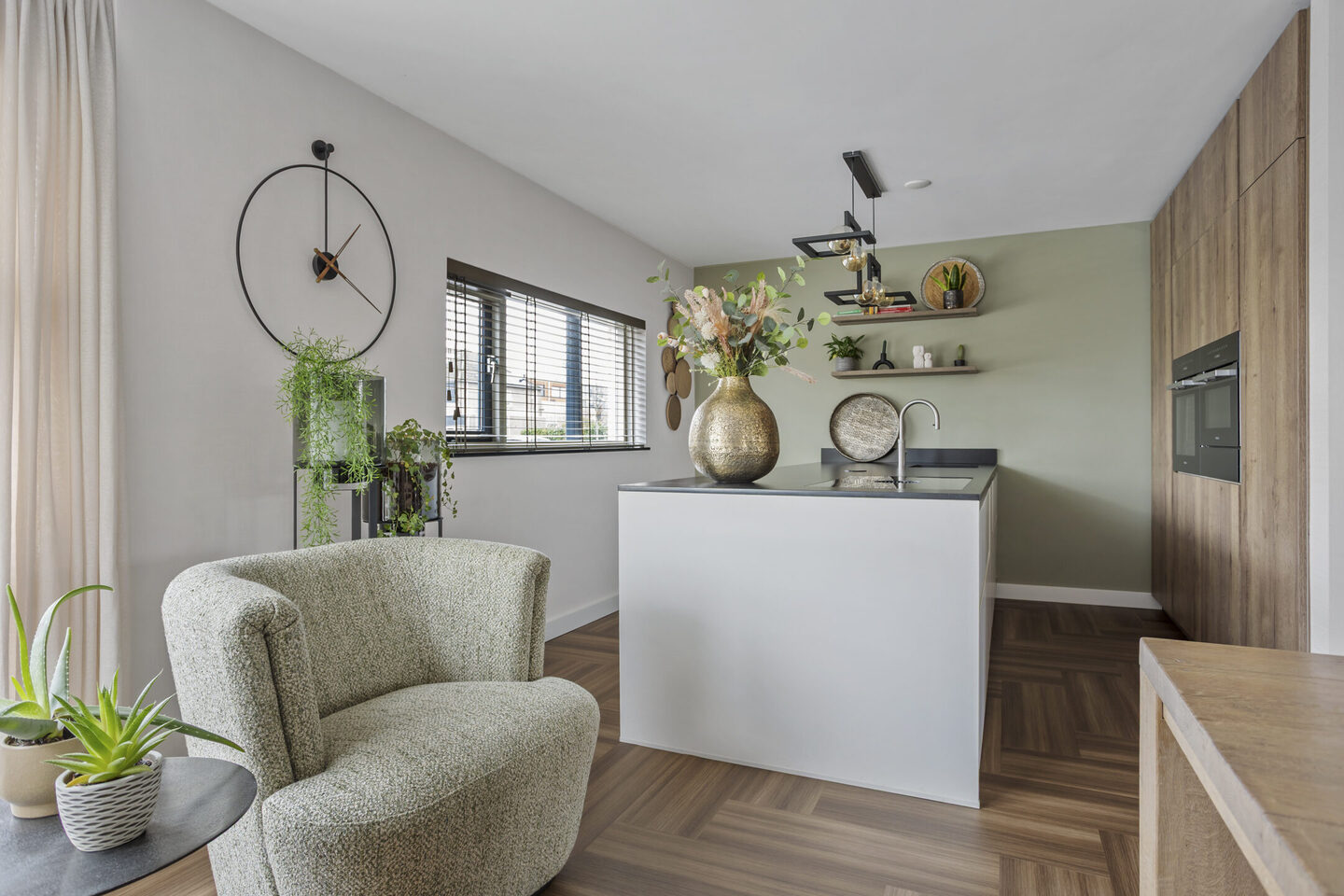 Terug in de woonkamer is er een royale eethoek met een prettige doorloop naar de keuken. De woonkeuken (2021) ligt aan de voorzijde en is een echte blikvanger: voorzien van een groot schiereiland, maatwerk hoge kasten en luxe inbouwapparatuur waaronder, twee ovens, een koelkast, vriezer, vaatwasser, Quooker en een Bora kookplaat. Tevens is de voorzijde deels voorzien van rolluiken.