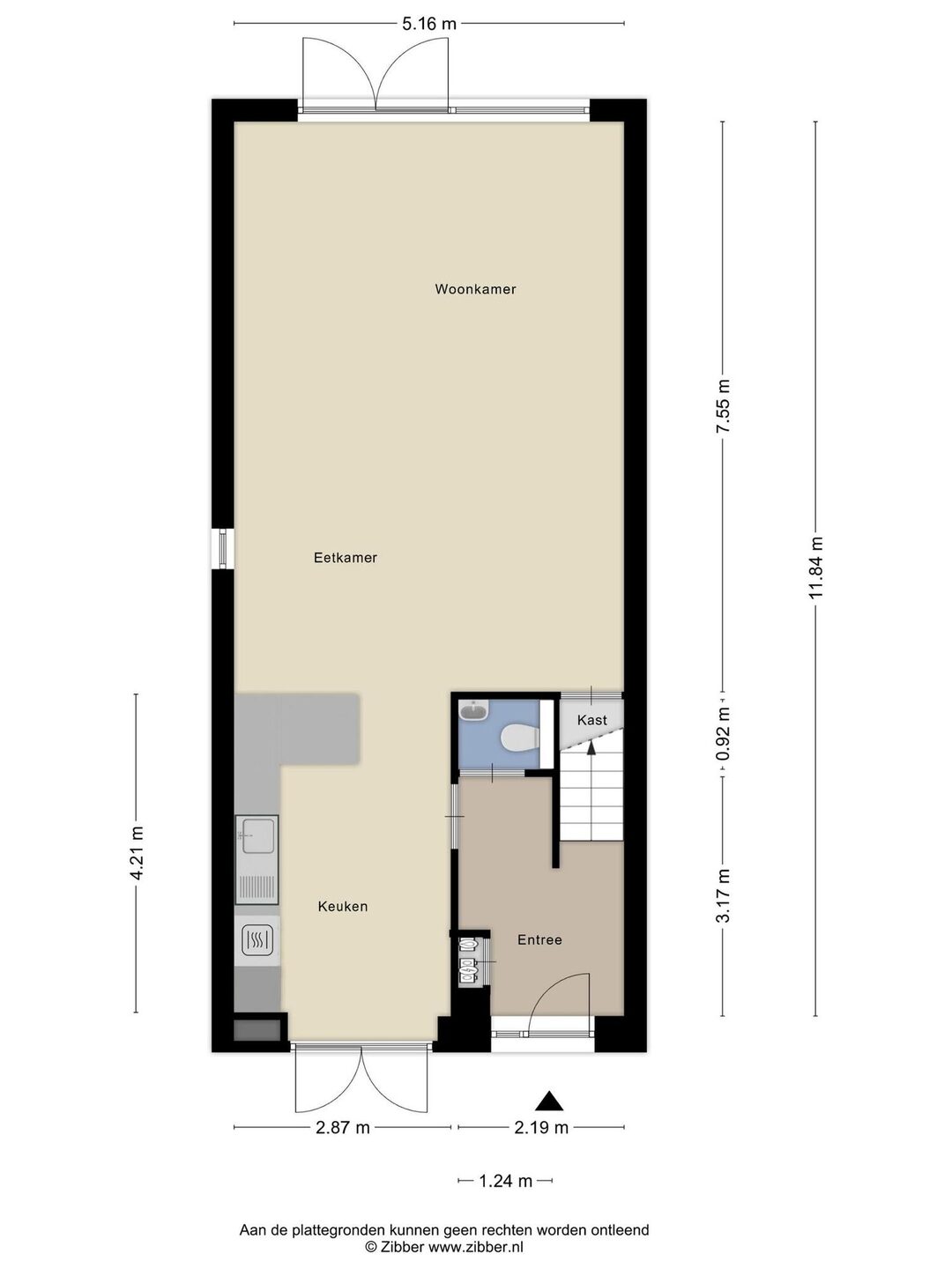 Entree met toegang tot het toilet, de meterkast en de trap naar de eerste verdieping. Vanuit de hal betreedt u de ruime open keuken, die aan de voorzijde van de woning is gelegen. Vanuit hier heeft u, door middel van openslaande deuren, ook toegang tot de voortuin. De keuken is voorzien van diverse apparatuur, zoals onder andere een Quooker, een oven en een inductiekookplaat. Vanuit de keuken heeft u toegang tot de zeer ruime woonkamer, die door de hoekligging van de woning ook nog een raam aan de zijkant heeft. Samen met de openslaande deuren naar de achtertuin zorgt dit voor veel lichtinval en een ruimtelijk gevoel.