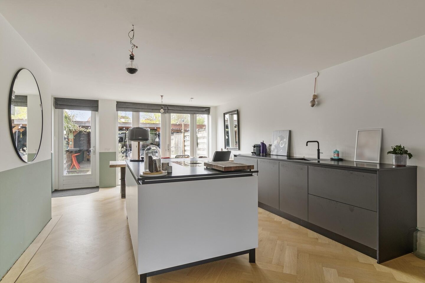 De uitgebouwde en speels ingedeelde woonkamer is voorzien van een houten vloer van massieve eikendelen en een moderne open keuken welke zich bevindt aan de achterzijde van de woning. De keuken (2020) is voorzien een kookeiland en diverse inbouwapparatuur zoals een Bora inductiekookplaat met geïntegreerde afzuiging, een vaatwasser (Miele), een koelkast, een oven met warmhoud lade (Miele), een Quooker en voldoende opbergruimte. De keuken is voorzien van vloerverwarming (2020).