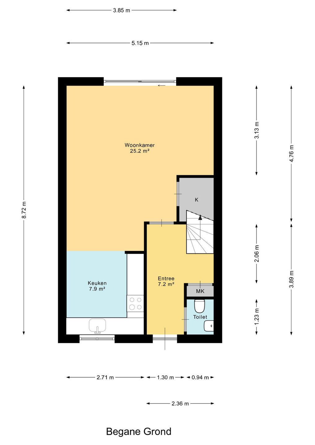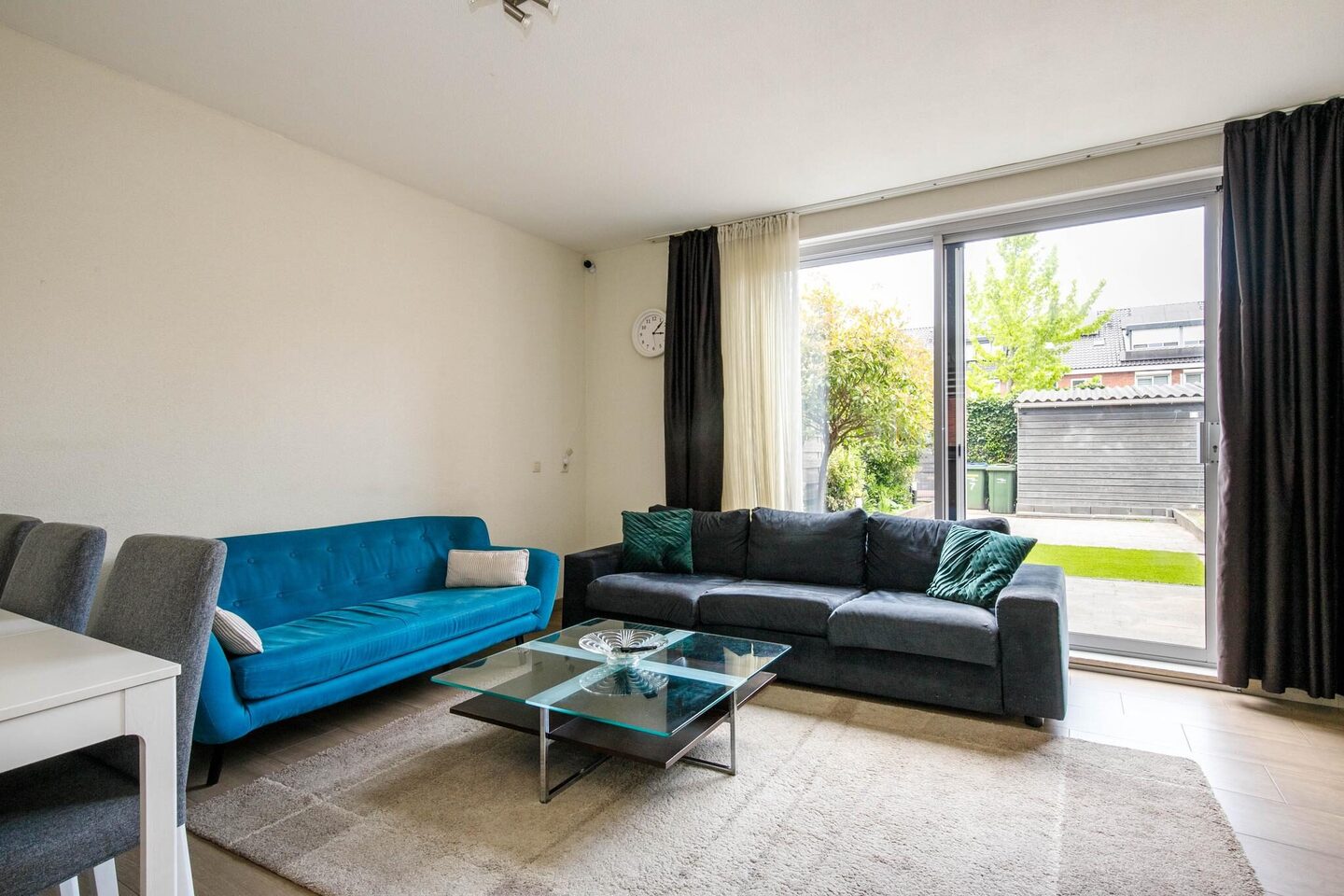 Entree, hal met toilet en meterkast en de trap naar de verdieping. Je bereikt de lichte woonkamer vanuit de hal, welke voorzien is van een plavuizen vloer met vloerverwarming. Onder de trap bevindt zich een trapkast, handig voor extra opbergruimte. De open keuken is in L-vorm gepositioneerd en voorzien van een koelkast, vriezer, vaatwasmachine, kookplaat en afzuigkap. De woning beschikt echter ook over een schuifpui, waar je de netjes aangelegde tuin mee bereikt.