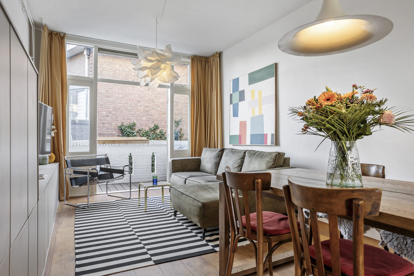 De woonkamer is afgewerkt met een warme eikenhouten vloer en beschikt over openslaande deuren naar het volledig gerenoveerde, zonnige balkon op het zuiden, waar u de hele dag van de zon kunt genieten.