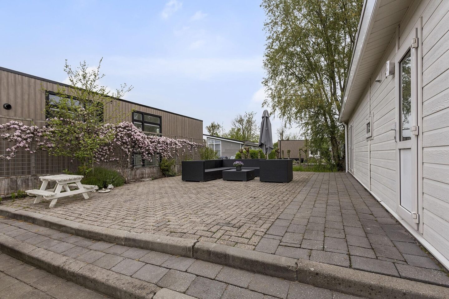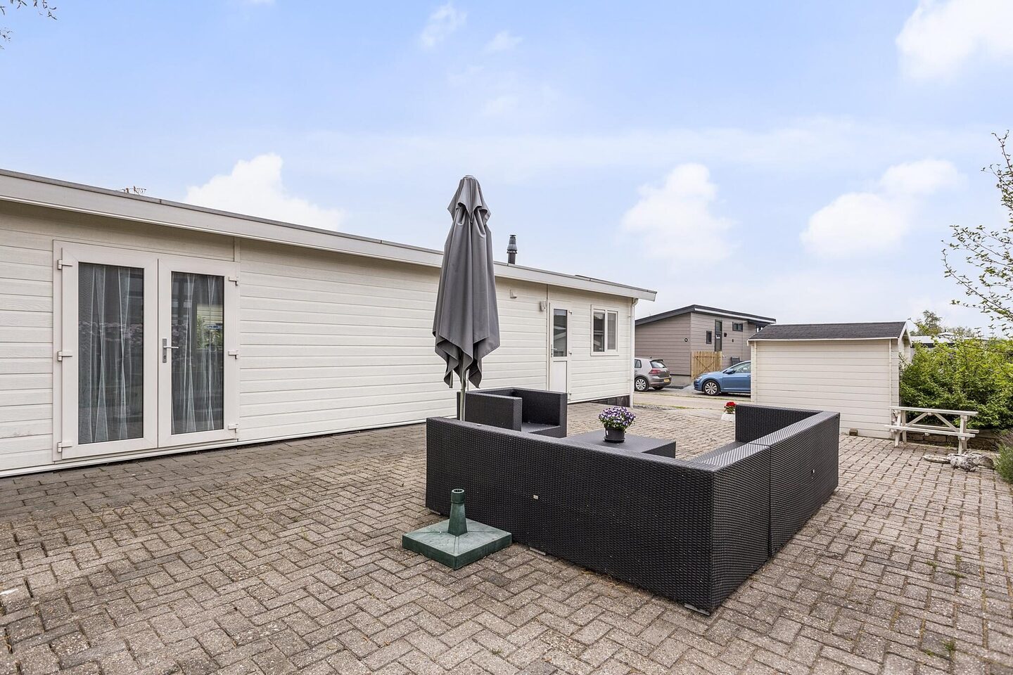 De tuin is gelegen rondom de woning. Er is hierdoor altijd wel een plekje te vinden in de zon. De tuin is onderhoudsvriendelijk aangelegd vanwege de klinkers en het grote terras. De tuin beschikt over een houten berging en een parkeerplaats. Op het grote terras is een loungeset aanwezig (deze blijft achter).