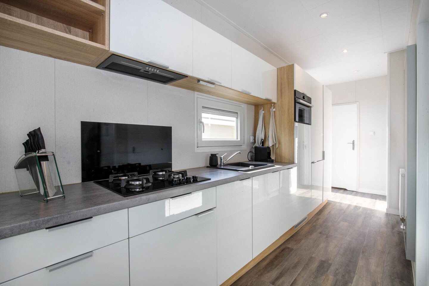 De ruime woonkamer is verbonden met de open keuken, waar een prachtige PVC vloer ligt. De woonkamer is uitgerust met airconditioning en heeft dubbele deuren die toegang bieden tot de tuin. De keuken is voorzien van diverse inbouwapparatuur, waaronder een koelkast met vriesvak, een combi oven/magnetron, een keukenkast met de Cv-ketel, een 4-pits gaskookplaat, een afzuigkap en een vaatwasser.