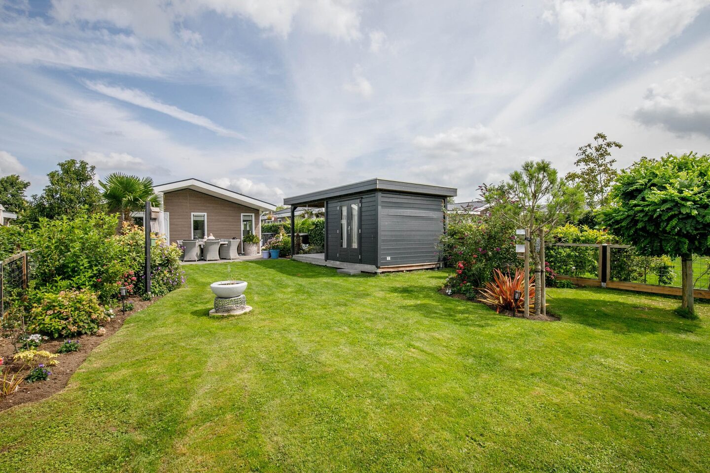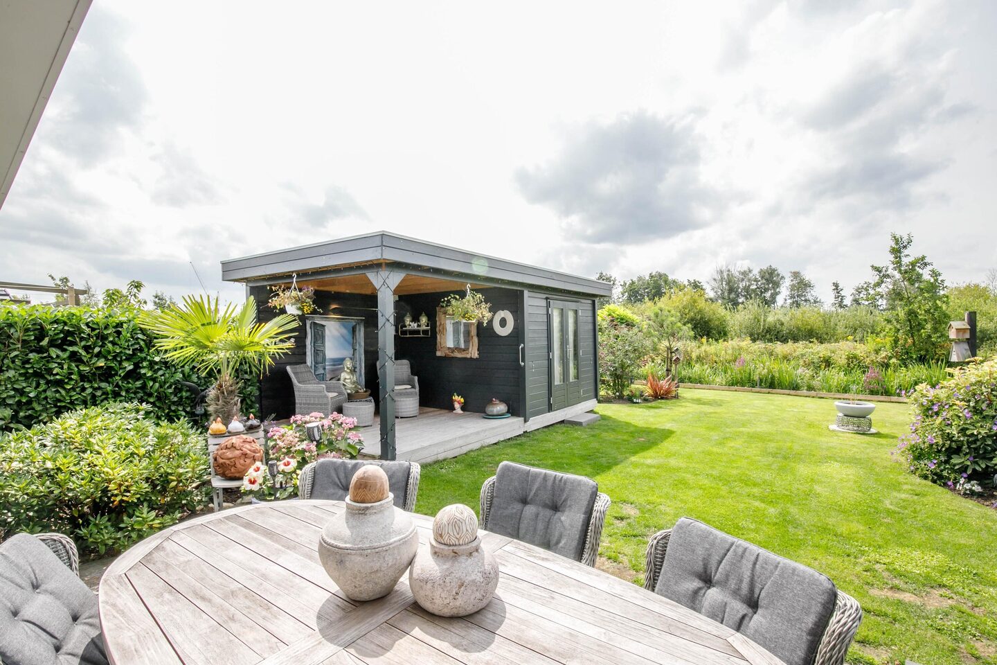 Via de openslaande deuren vanuit zowel de woonkamer als de keuken is de tuin te bereiken. Er is een ruime zij- en achtertuin en de tuin is gelegen aan het water. De tuin is prachtig aangelegd en voorzien van een ruim terras welke is voorzien van een overkapping doormiddel van het dak dat doorloopt. De berging is gepositioneerd in de achterzijde van de tuin en beschikt ook over een overkapping, hier zit u heerlijk in de schaduw.