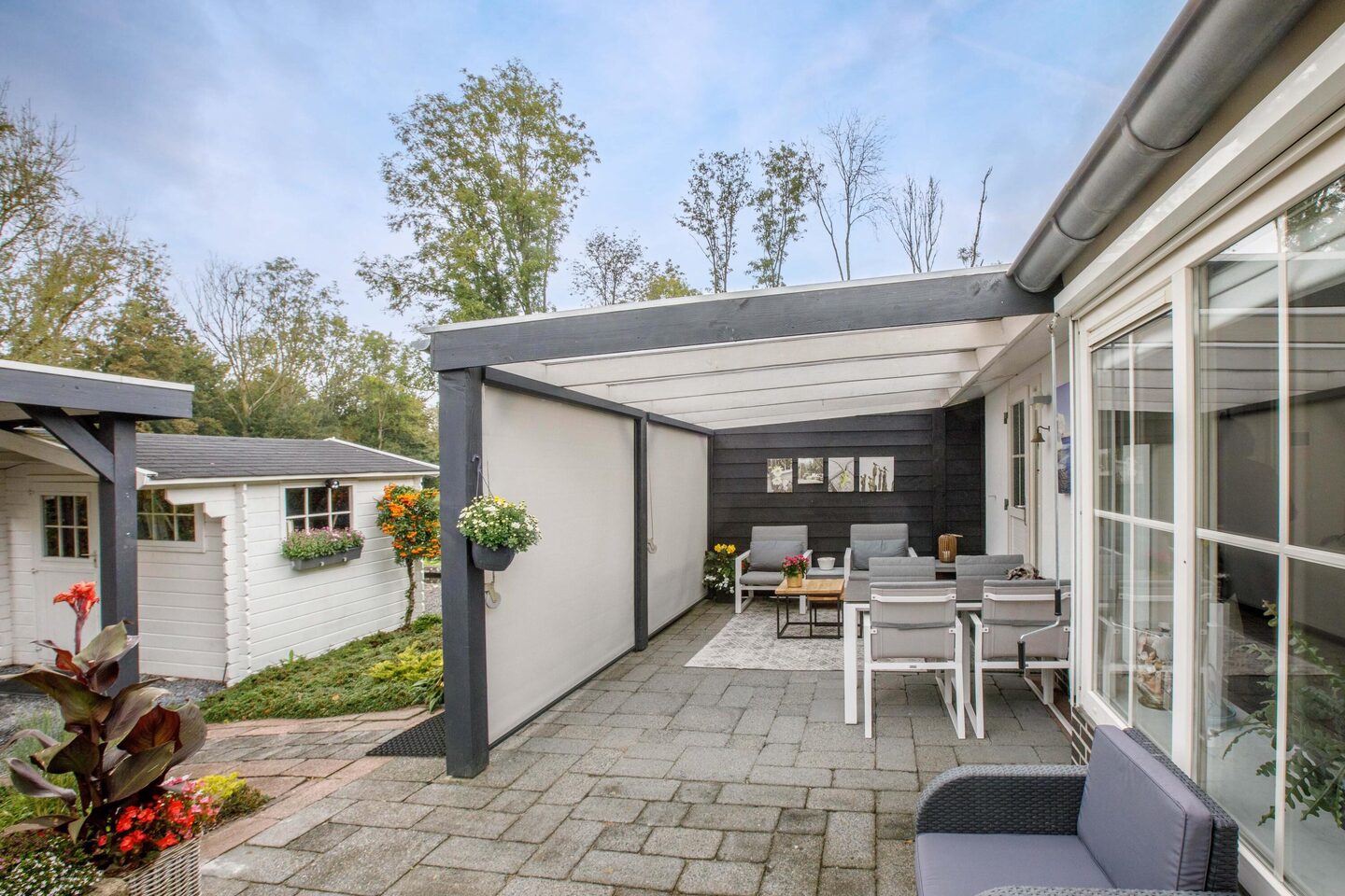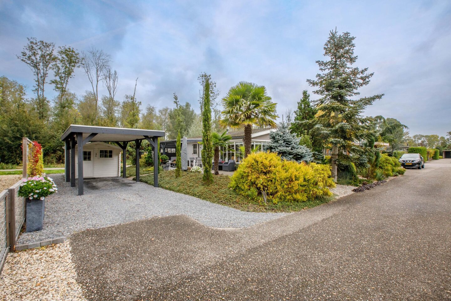 Aan de buitenzijde valt direct de royale lichtdoorlatende overkapping op met zonneschermen: dé plek om elk seizoen te ontspannen. De tuin biedt tevens een houten berging én een carport met een lange oprit waar meerdere auto's kunnen staan. Het chalet is voorzien van onderhoudsvriendelijke kunststof kozijnen en is gelegen op eigen grond!