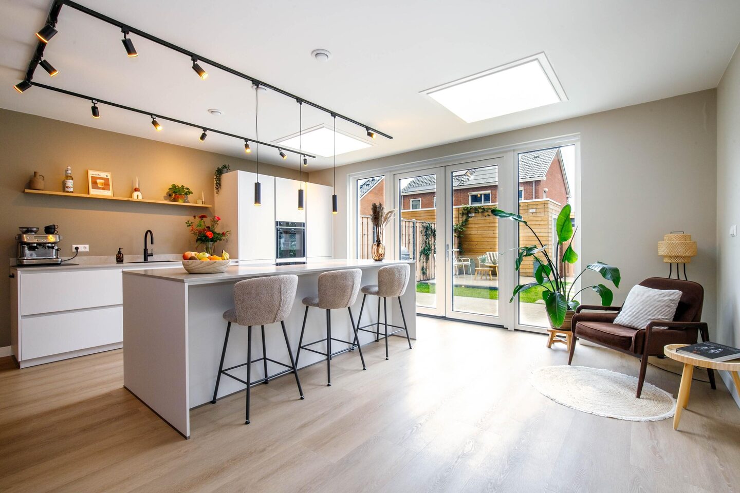 Vanuit de hal betreedt je de ruime en lichte woonkamer door middel van een moderne deur met glas. Aan de voorzijde van de woning bevindt zich het zitgedeelte, en aan de achterzijde van de woning is een moderne en ruime woonkeuken gerealiseerd. Deze keuken is voorzien van diverse inbouwapparatuur waaronder een vaatwasser, een ruime koelkast, een vriezer, een Bora kookplaat met afzuiging, stoomoven en een Quooker. De keuken beschikt over een wandgedeelte (met koffiehoek) en een kookeiland met bar. De lichtkoepels in de uitbouw aan de achterzijde zorgen voor extra daglicht, een fijne toevoeging aan dit huis! In de woonkamer is bovendien een uitgebouwde trapkast gerealiseerd, met moderne, houten wandpanelen afwerking.