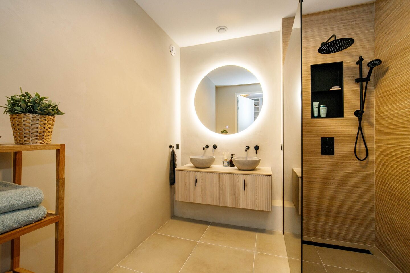 Op deze verdieping is tevens een apart toilet aanwezig. De strak afgewerkte badkamer is voorzien van dubbele waskommen met meubel, een elektrische designradiator en een ruime inloopdouche.