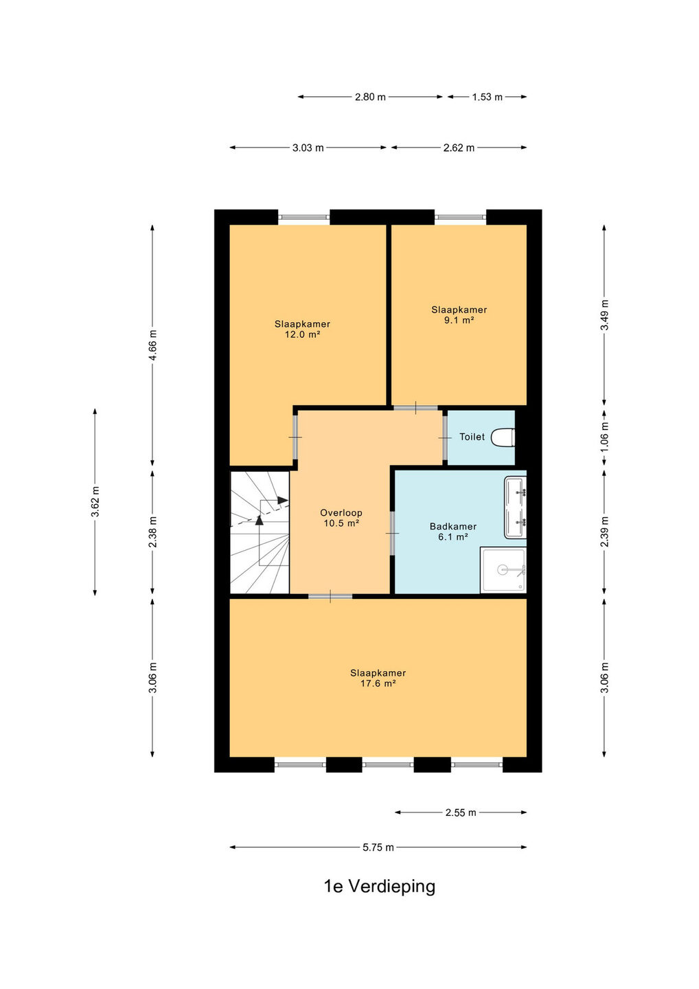 Op de eerste verdieping bevinden zich drie ruime slaapkamers en een verassend ruime overloop. Aan de voorzijde ligt de hoofdslaapkamer, over de volledige breedte van het huis, waar je een grote garderobekast kan neerzetten. Aan de achterzijde bevinden zich de overige twee slaapkamers.