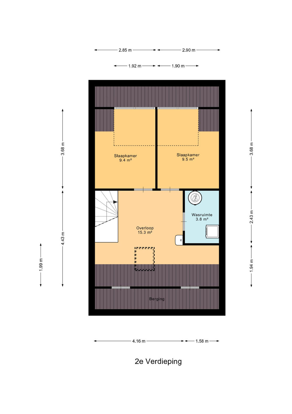 Op de tweede verdieping bevinden zich nog twee slaapkamers, met een brede dakkapel aan de achterzijde, waardoor er veel licht binnenvalt. Daarnaast is er een praktische technische ruimte aanwezig met aansluitingen voor de wasmachine en droger. Ook is hier de opstalplaats van de warmtepomp, omvormer van de zonnepanelen en de WTW-installatie. Achter de knieschotten is aan beide kanten tevens veel bergruimte.