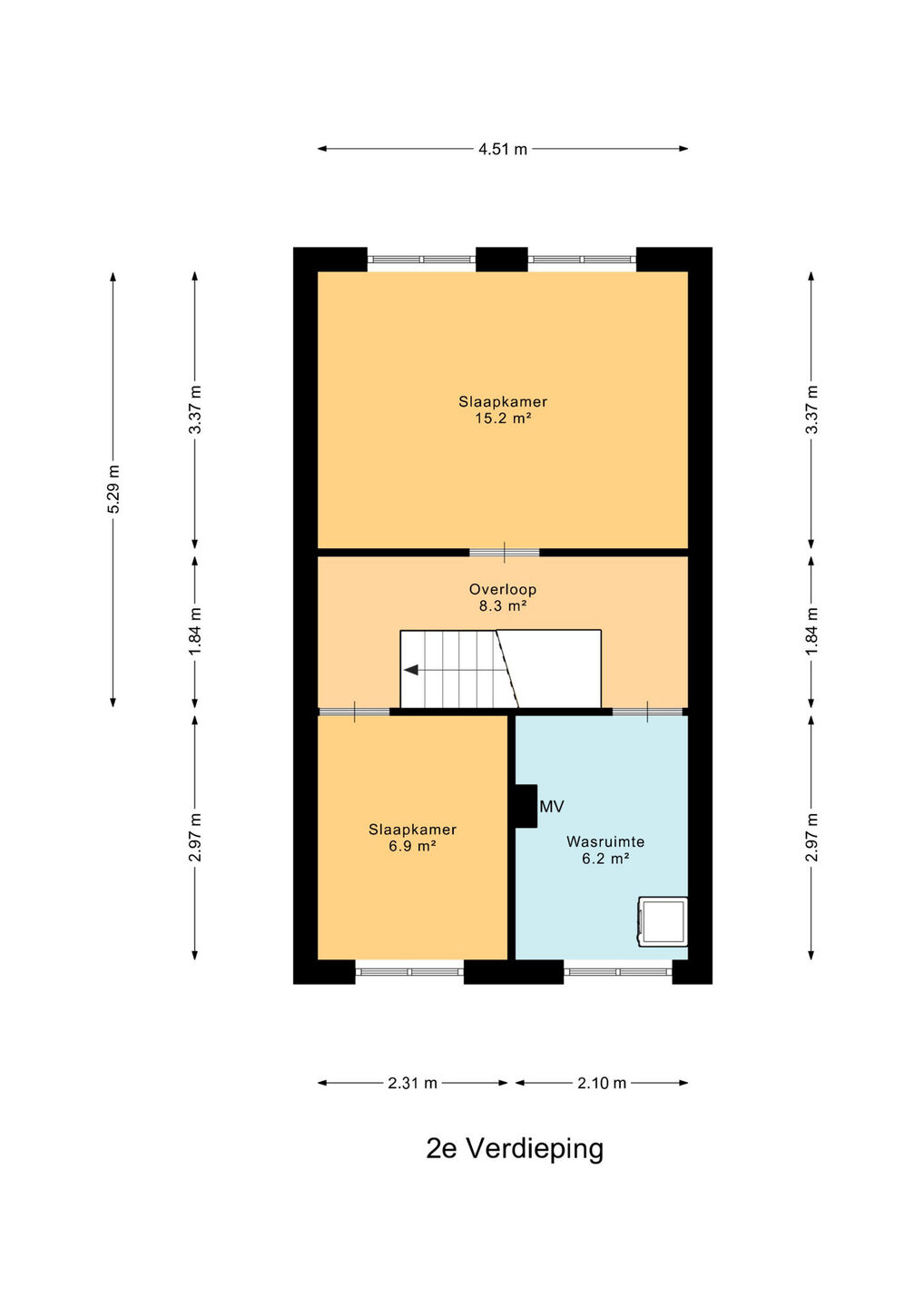 De tweede verdieping heeft dezelfde indeling als de eerste verdieping en is wederom voorzien van twee slaapkamers en een wasruimte. Er is een slaapkamer gelegen aan de voorzijde en een slaapkamer over de volledige breedte aan de achterzijde. Deze ruimte is wederom voorzien van airconditioning. In de wasruimte is er een wasmachine- en drogeraansluiting en ook hangt hier de mechanische ventilatie unit.