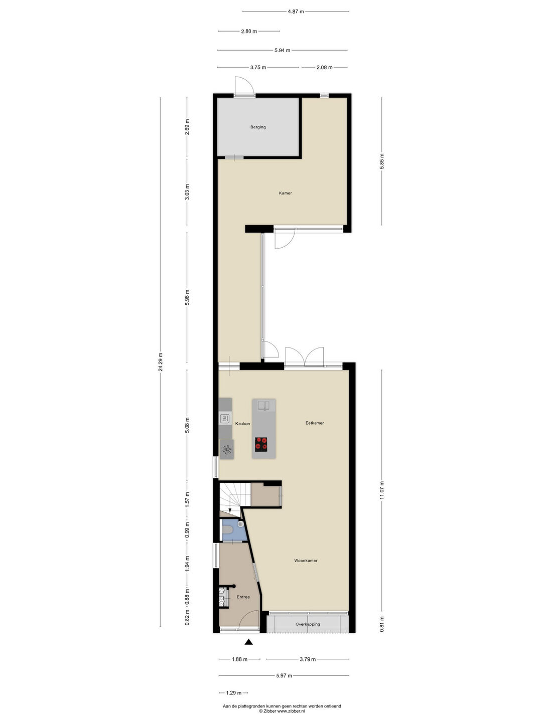 Via de keuken bereikt u de uitbouw aan de achterzijde van de woning. Deze is toegankelijk via een gang met veel glas, wat zorgt voor een prettige lichtinval en een ruimtelijk gevoel. In de uitbouw bevindt zich een royale, multifunctionele ruimte die voor diverse doeleinden te gebruiken is – denk aan een werkkamer, speelruimte of extra slaapkamer. Aangrenzend is een praktische berging aanwezig, ideaal voor het opbergen van fietsen, tuingereedschap of overige spullen. Deze berging biedt tevens een directe uitgang naar de achterzijde van de woning.
