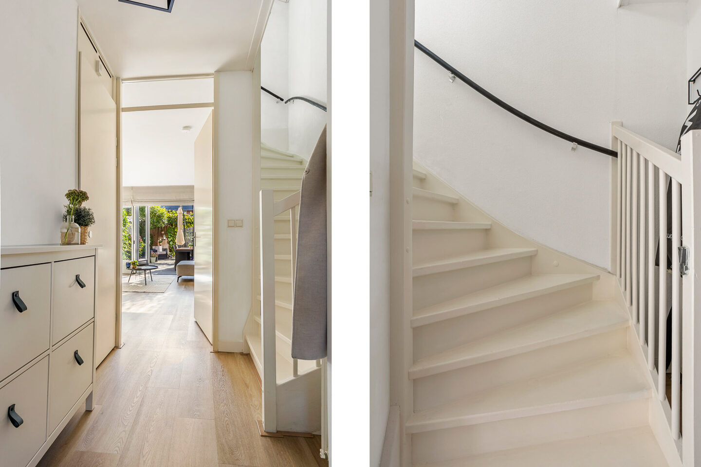 U betreedt de woning via de entree met hal, voorzien van meterkast, trapopgang en een toilet met fonteintje. De ruime woonkamer is strak afgewerkt en is heerlijk licht dankzij de openslaande deuren naar de achtertuin. Een praktische trapkast biedt extra bergruimte. Op de gehele verdieping ligt een strakke ambiant PVC-vloer met vloerverwarming, wat zorgt voor comfort én een moderne uitstraling.