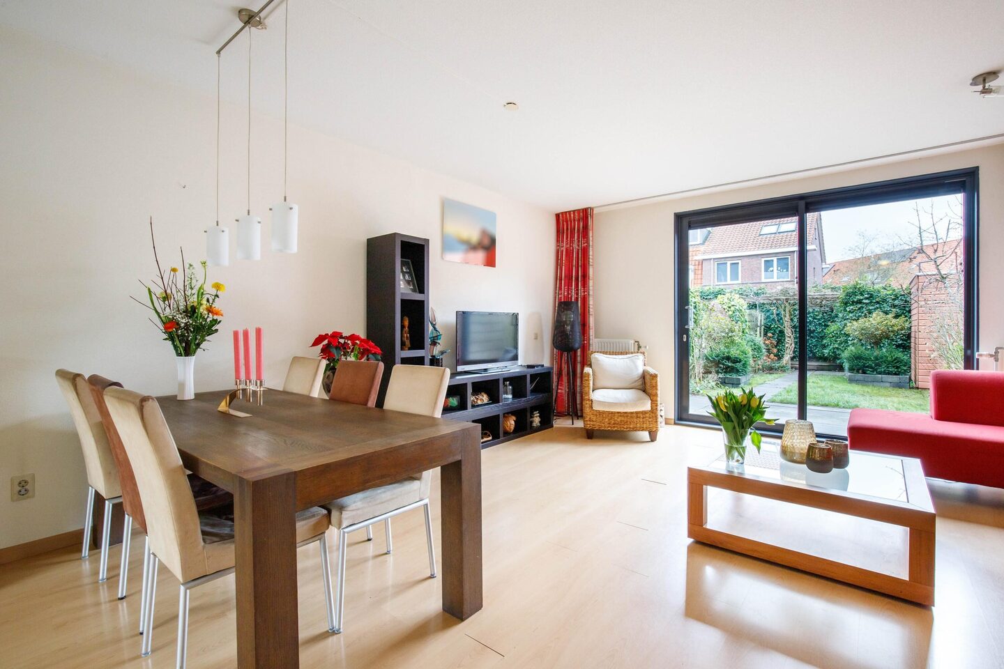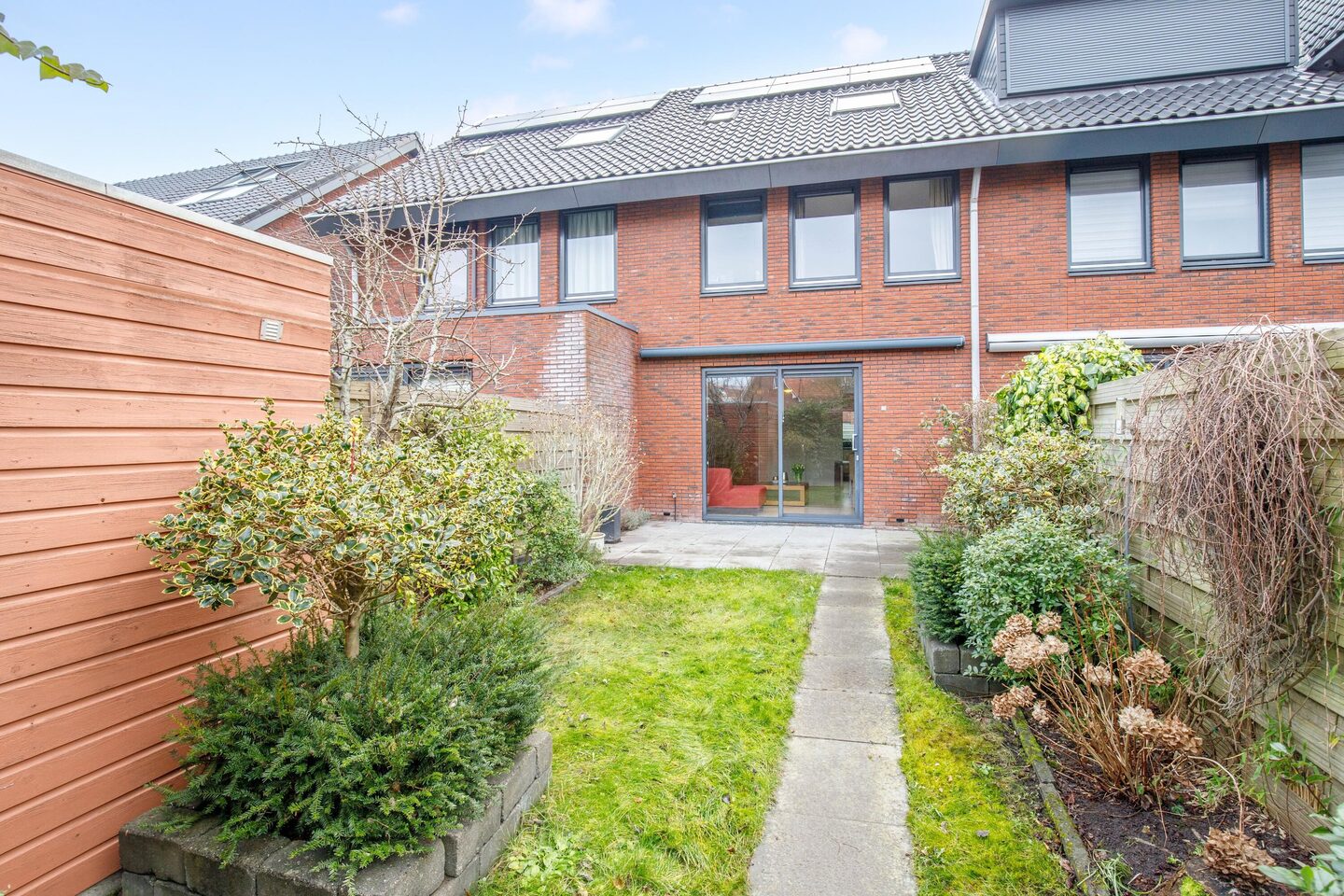 Via de schuifpui is er toegang tot de achtertuin. De tuin is maar liefst circa 12 meter diep en gunstig gelegen op het westen, waardoor je tot in de avond van de zon kunt genieten. Daarnaast is de tuin voorzien van een elektrisch bedienbaar zonnescherm, een houten berging en een praktische achterom. De achterom geeft toegang tot een achtergelegen parkeerhaven, wat zorgt voor een vrije ligging aan de achterzijde van de woning.