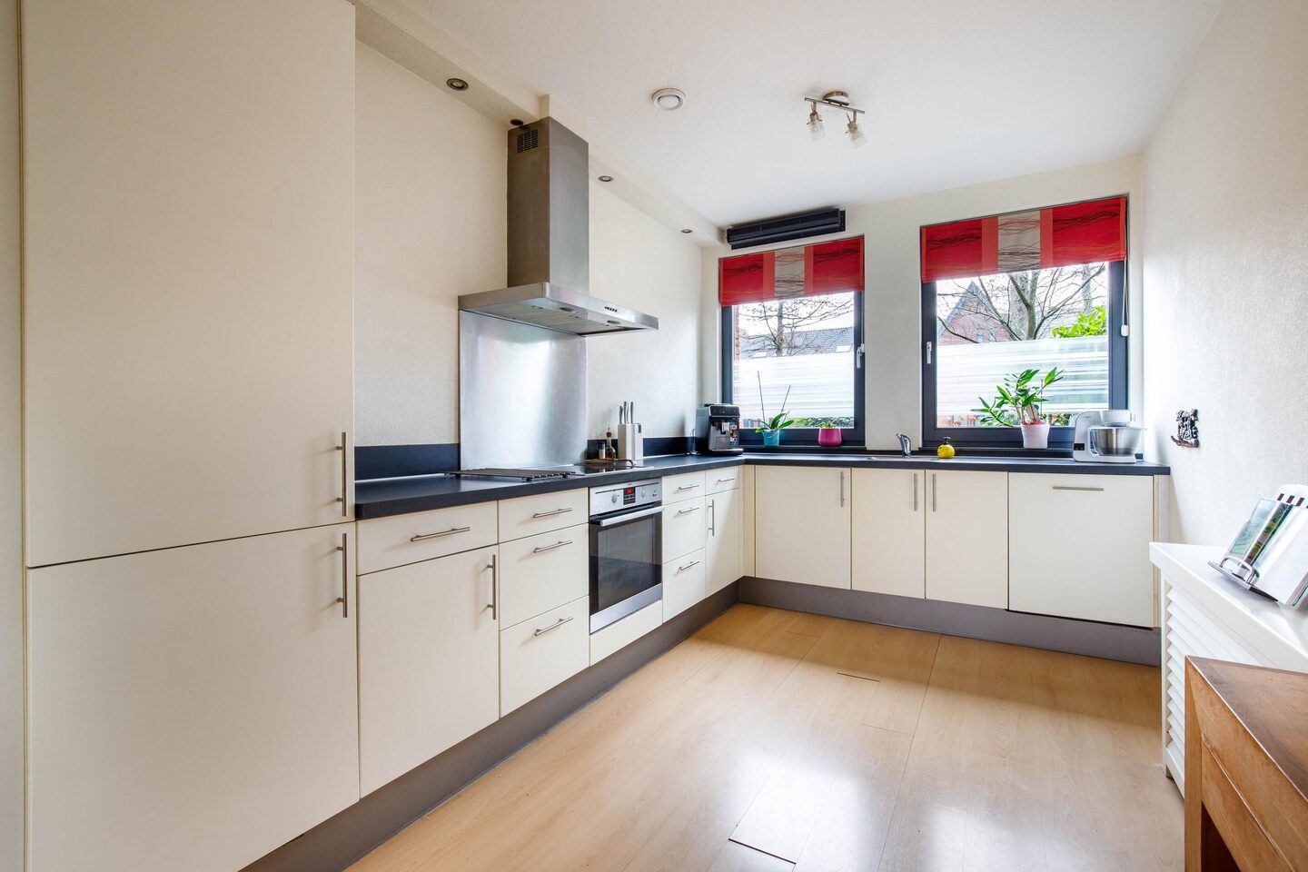 De ruime woonkamer is voorzien van een schuifpui, wat zorgt voor veel lichtinval in de woning. Aan de voorzijde van de woning bevindt zich de ruim opgezette open keuken. De keuken beschikt over diverse inbouwapparatuur zoals een vaatwasser (2025), oven (2021), koel/vries combinatie en een 4-pits keramische kookplaat met afzuigkap. Daarnaast beschikt de woonkamer over een praktische trapkast, die zorgt voor extra opbergruimte.
