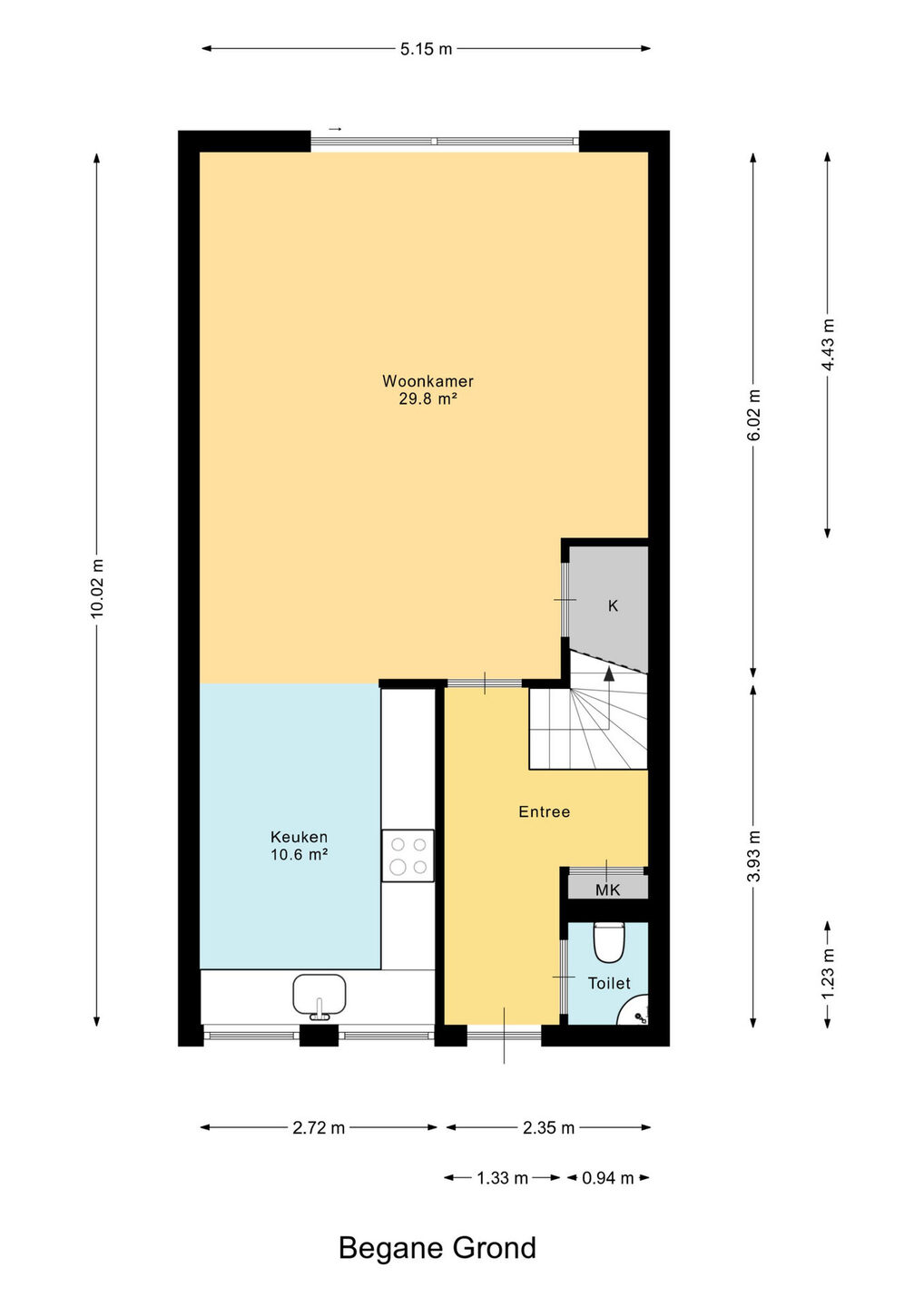 Entree, hal met toegang tot de meterkast en het toilet (hangend met fonteintje), en de trap met toegang tot de eerste verdieping.