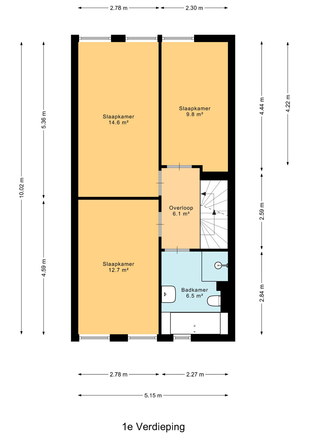 De overloop biedt toegang tot drie slaapkamers en de badkamer. Twee slaapkamers zijn gelegen aan de achterzijde van de woning. De slaapkamer aan de voorzijde beschikt over hoge raampartijen, wat zorgt voor veel lichtinval in de kamer.
