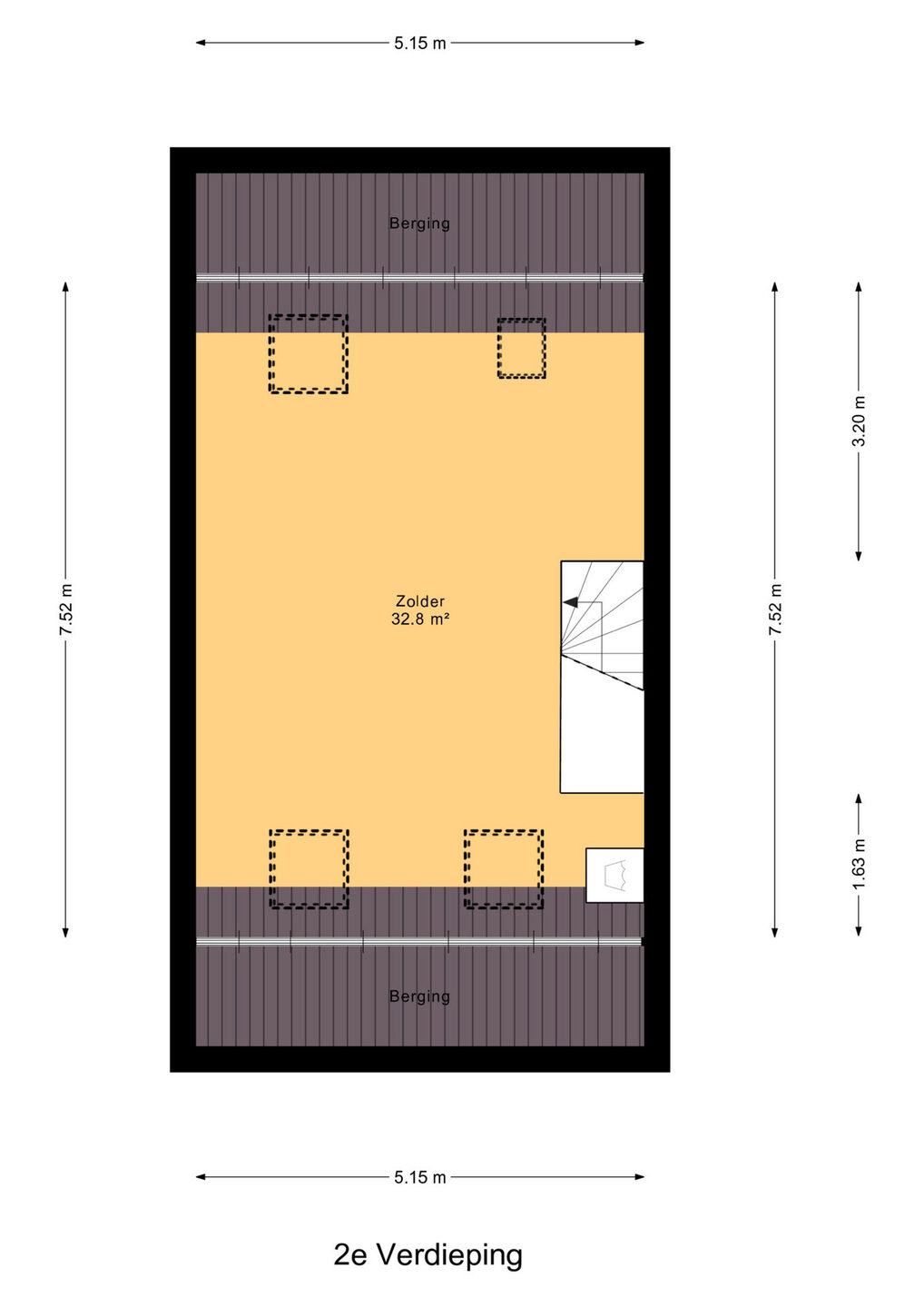 Open ruimte die beschikt over aansluitingen voor de wasmachine en droger. Dankzij de hoge nok en vier dakramen is er volop ruimte en licht. Deze verdieping biedt daardoor uitstekende mogelijkheden voor het creëren van meerdere (extra) slaapkamers.
