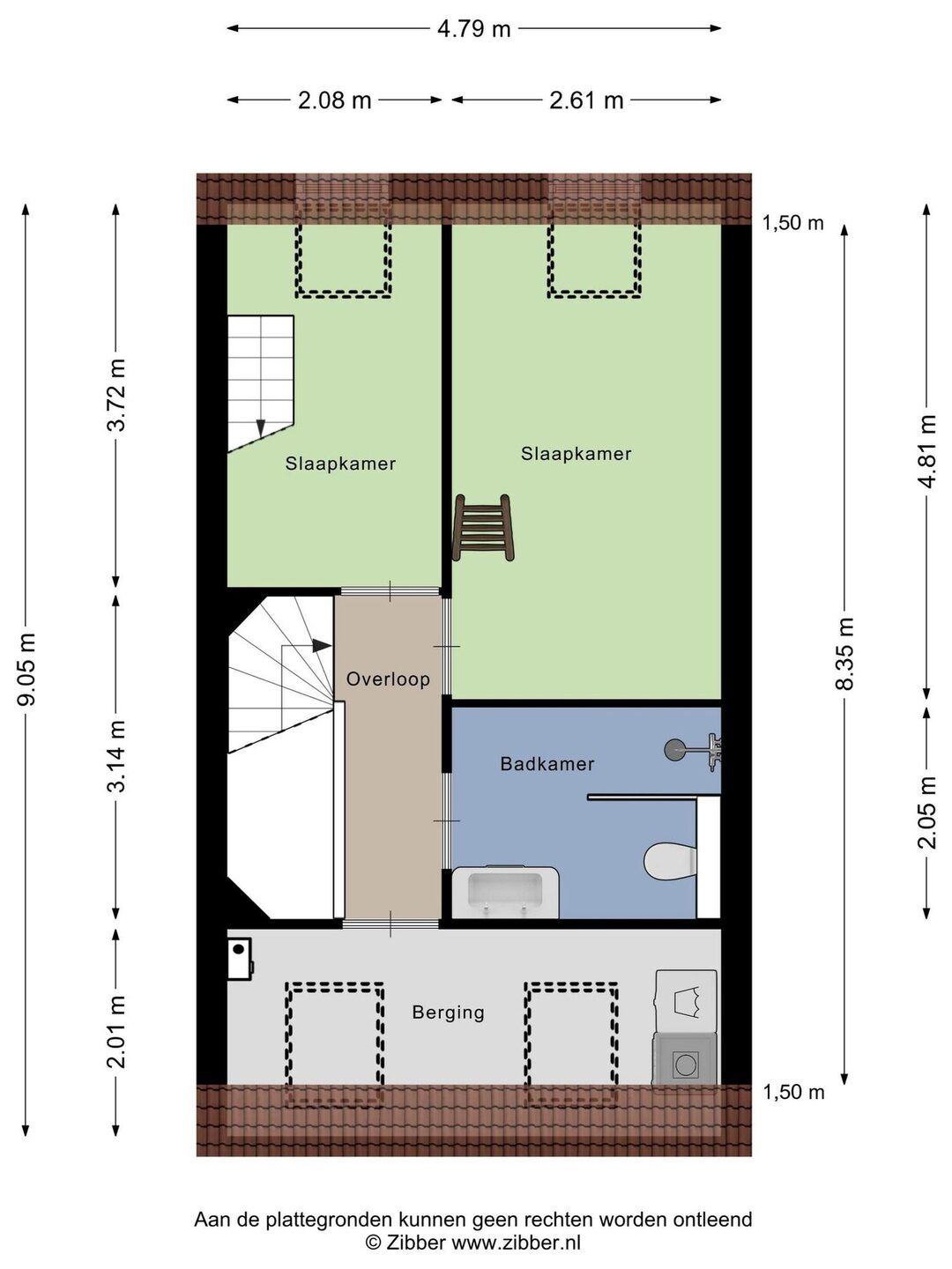 Op deze verdieping bevinden zich twee ruimte slaapkamers. Beide slaapkamers zijn voorzien van een grote raampartij en een vide welke te bereiken zijn via een trap. Er is een aparte wasruimte aanwezig, welke is voorzien van twee dakramen, de mechanische ventilatie unit (vernieuwd in 2024 en in 2025 de kanalen gereinigd) en de wasmachine- en drogeraansluiting.