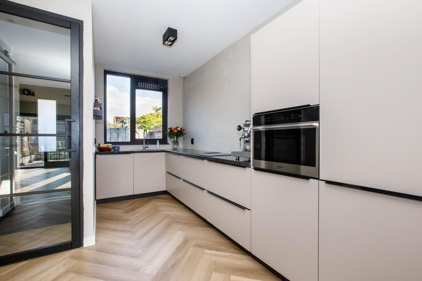 Je komt binnen in de hal, waar een deel van de berging bij de woning is betrokken. Hierdoor is er een ruime garderobe ontstaan, met voldoende plek om al je jassen en schoenen netjes op te bergen. Via de moderne zwarte deur met glas kom je in de lichte en ruime woonkamer. De woonkamer is voorzien van een PVC-visgraatvloer inclusief vloerverwarming en heeft veel lichtinval dankzij de schuifpui, de ramen en het zijraam. De moderne keuken (2021) is uitgerust met diverse inbouwapparatuur, waaronder een inductiekookplaat met geïntegreerde afzuiging, een combi-oven, een vaatwasser, een koelkast en een vriezer. Via een tweede moderne deur bereik je de trapopgang, waar zich ook het toilet (2021) bevindt.