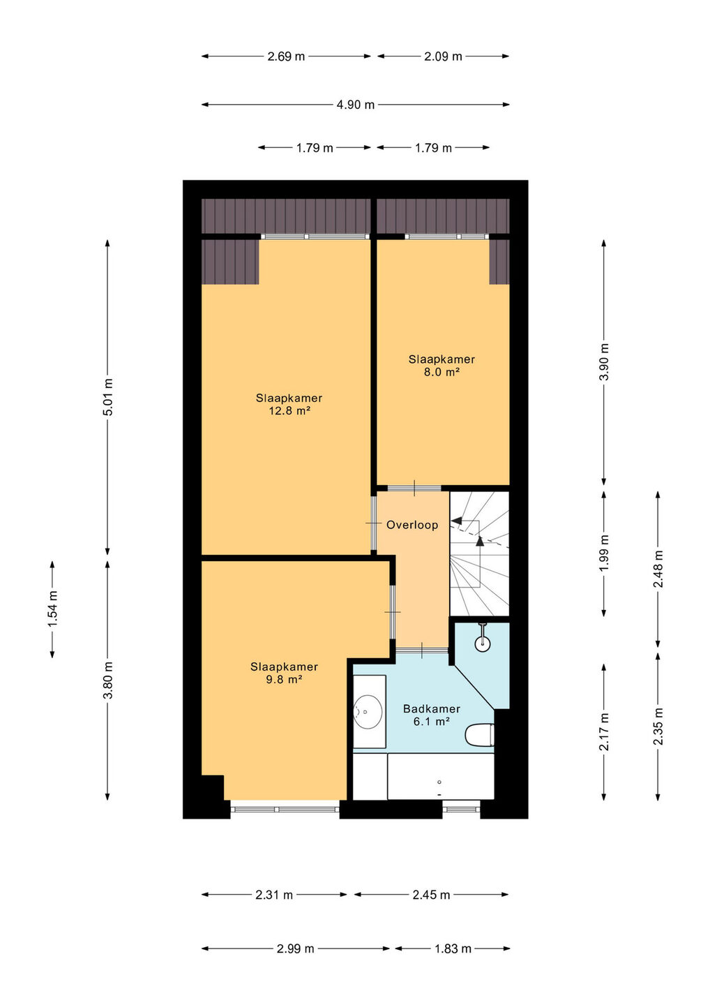 De overloop geeft toegang tot drie slaapkamers en de badkamer. Aan de achterzijde van de woning bevinden zich twee slaapkamers. Aan de voorzijde bevinden zich de derde slaapkamer en de vergrote badkamer. De luxe badkamer (2021) is uitgerust met een design radiator, toilet, een ligbad, een wastafelmeubel met kom en kraan, en een inloopdouche. Daarnaast is de badkamer afgewerkt met luxe tegelwerk en stijlvolle koperen accessoires.