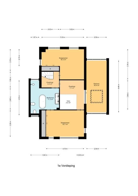 Via de open trap bereikt u de overloop op de eerste verdieping, die toegang biedt tot twee slaapkamers, een kantoor, de badkamer en de trap naar de tweede verdieping. Via de vide staat u in contact met de woonkamer. De ruime slaapkamer aan de voorzijde van de woning is voorzien van een inbouwkast en biedt ook directe toegang tot de badkamer. De badkamer is voorzien van een inloopdouche, een vrijstaand ligbad, een designradiator, een wastafelmeubel met dubbele kranen, een bidet en een hangend toilet. Bovendien zijn er ook twee ramen aanwezig welke het daglicht naar binnen brengen. Aan de achterzijde bevindt zich nog een ruime slaapkamer welke ook beschikt over een inbouwkast. Aan de rechterzijde van de woning is een groot kantoor gelegen, dat ideaal is voor thuiswerken.