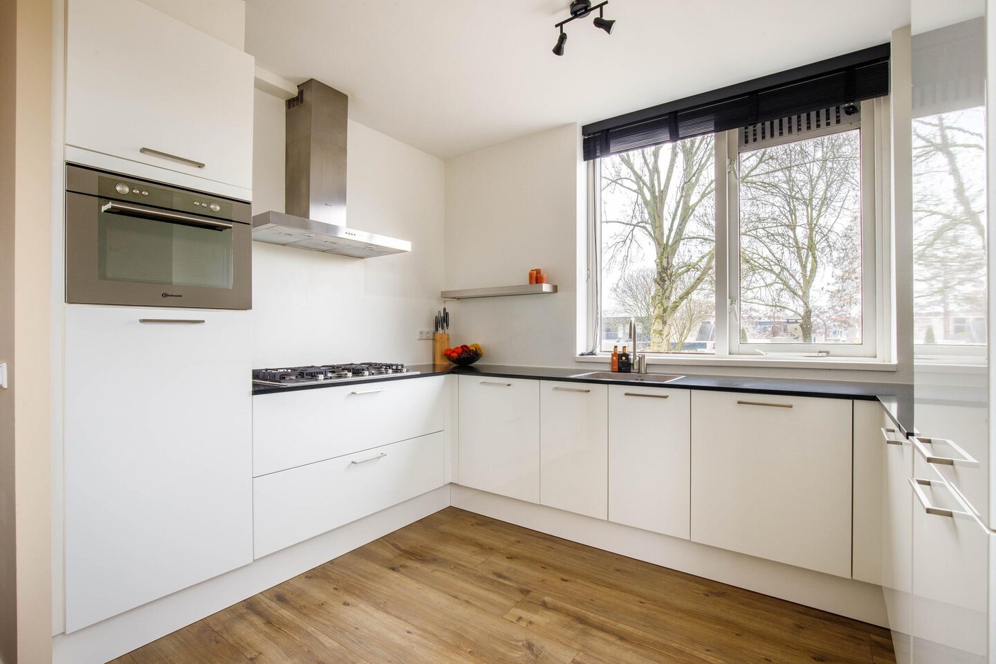 Op de eerste verdieping vindt u een ruime en lichte woonkamer met een halfopen keuken en een eetgedeelte tussen beide ruimtes. De keuken is modern uitgevoerd; witte hoogglans keukenkasten en een zwart composiet werkblad. Daarnaast is de keuken voorzien van diverse inbouwapparatuur zoals een koelkast, een vriezer, een 5-pits gaskookplaat met RVS-afzuigkap, een combi-oven en een vaatwasser. De CV-installatie (2024) is weggewerkt achter een van de keukenkasten.