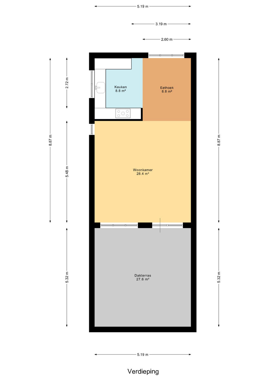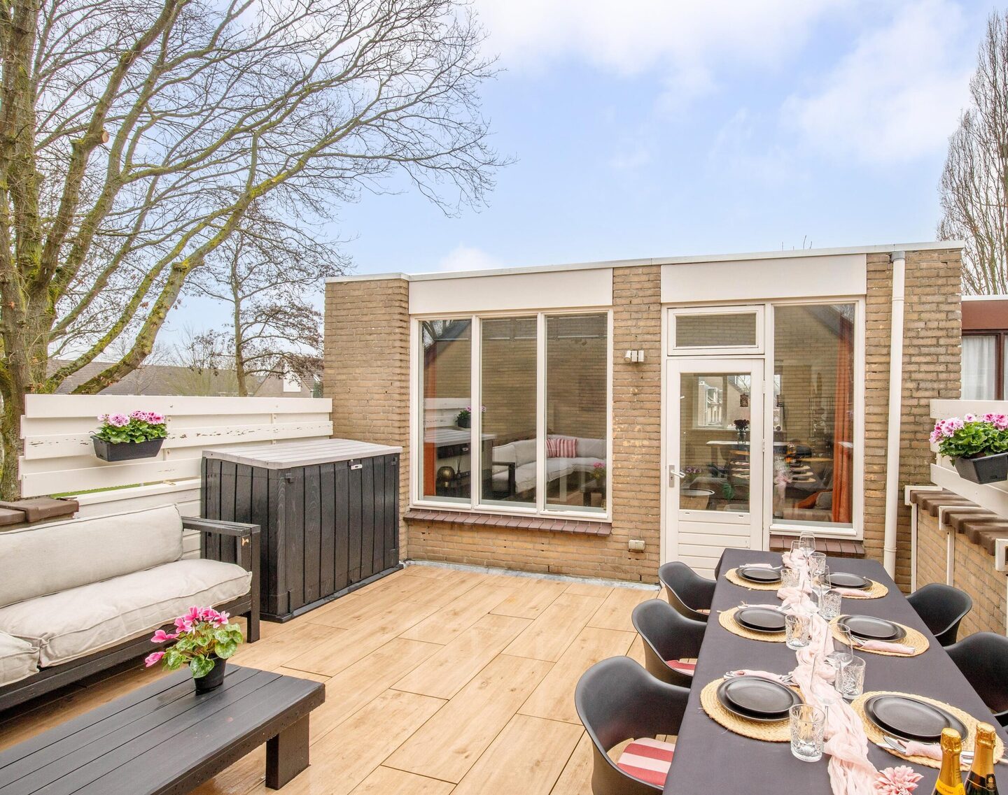 Vanuit de woonkamer stapt u zo het royale dakterras van circa 28 m² op. Dankzij de gunstige ligging op het noordwesten kunt u hier zowel 's middags als 's avonds heerlijk van de zon genieten. Het terras biedt veel privacy en heeft nauwelijks inkijk van omwonenden, waardoor u in alle rust kunt ontspannen en gezellig buiten kunt eten.