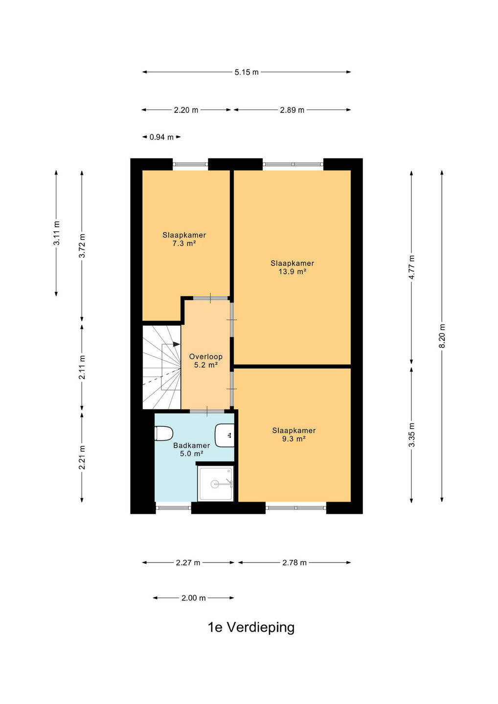 Op de eerste verdieping brengt de overloop je naar twee comfortabele slaapkamers aan de achterzijde en een derde slaapkamer aan de voorzijde. De badkamer is modern en compleet ingericht met een hangend toilet, designradiator, stijlvol wastafelmeubel met dubbele kraan en een ruime inloopdouche.