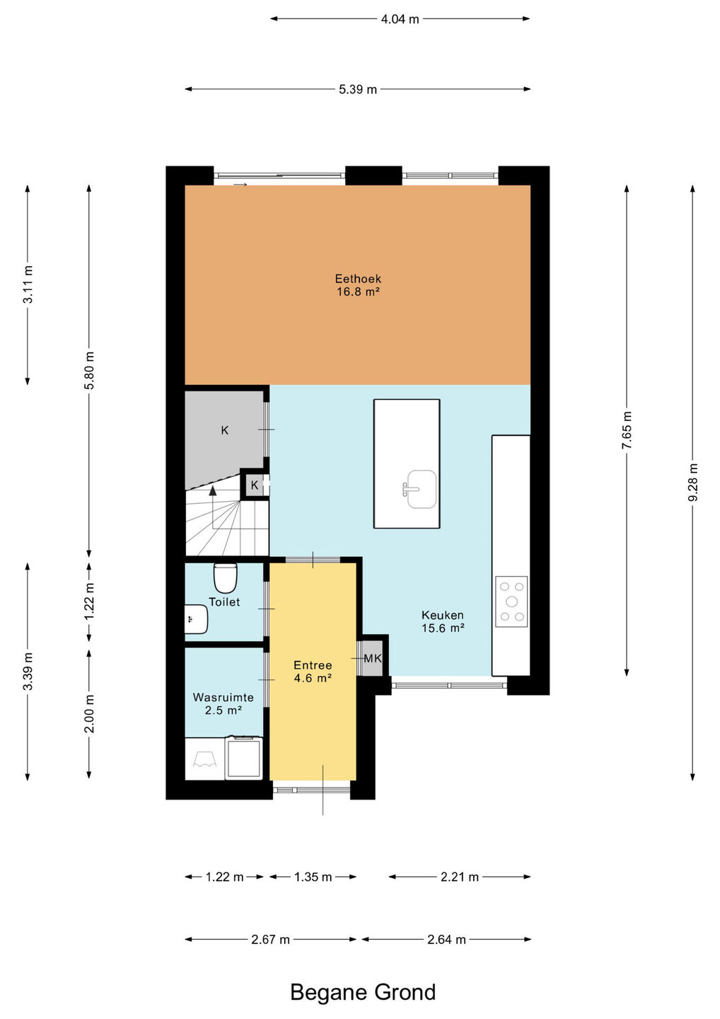 Entree met toegang tot de keuken, het toilet met fonteintje en de wasruimte waar de wasmachine en droger zijn gesitueerd. Bij binnenkomst in de keuken valt direct de lichte en ruime opzet op. De moderne open keuken beschikt over een groot kookeiland en een ruime eethoek een heerlijke plek om te koken en gezellig samen te komen. In deze ruimte bevindt zich ook de trap naar de eerste verdieping met daaronder een praktische trapkast. Via de eethoek heeft u toegang tot de tuin middels twee openslaande deuren, wat zorgt voor een ruimtelijk en open gevoel.