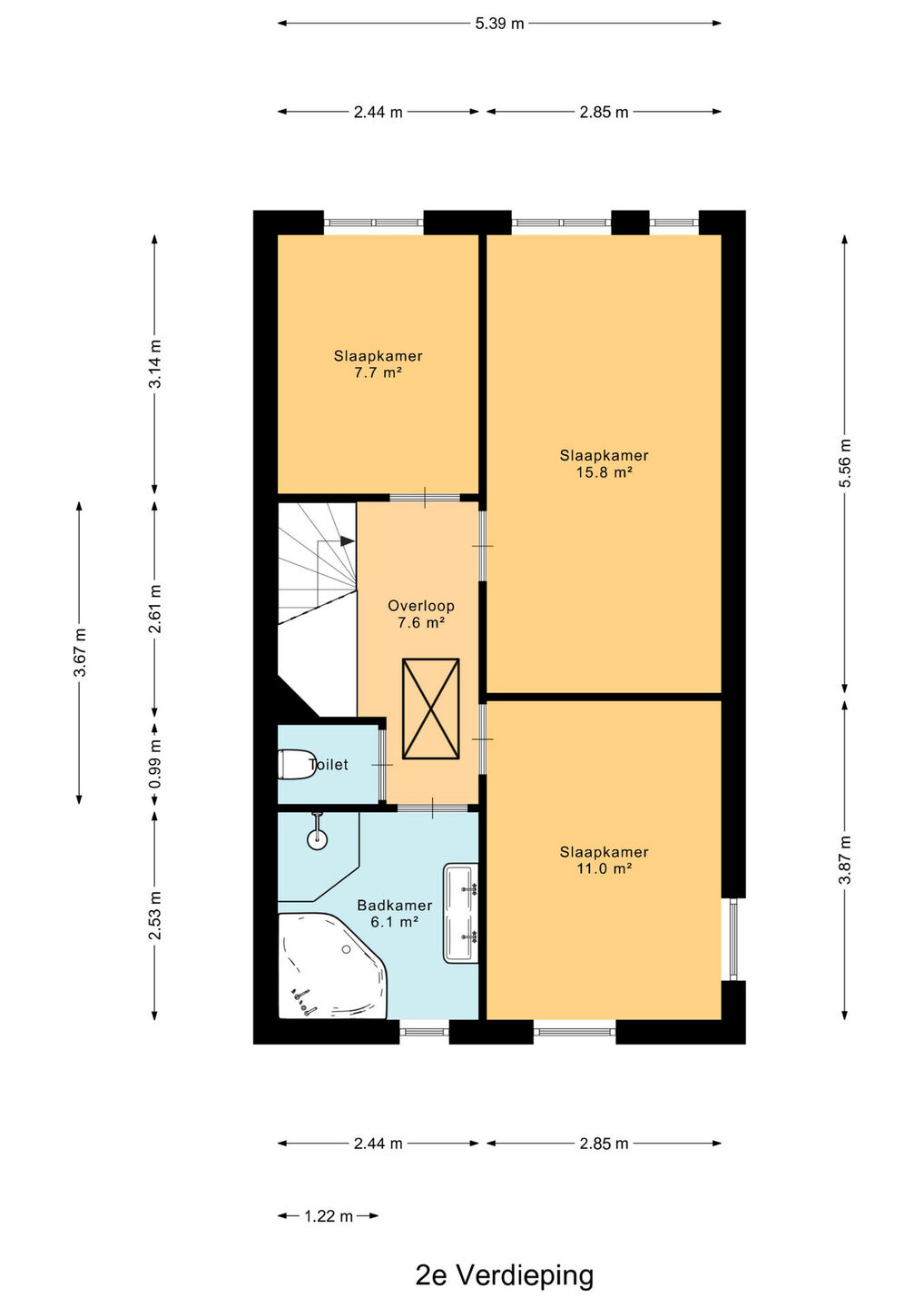 Op de tweede verdieping is een grote dakkapel geplaatst, waardoor er drie ruime slaapkamers zijn ontstaan. Aan de achterzijde bevinden zich twee slaapkamers en aan de voorzijde nog een derde slaapkamer. De badkamer is modern en compleet uitgerust met een ligbad, een dubbele wastafel en een inloopdouche. Dankzij het aanwezige raam geniet u hier van natuurlijke ventilatie en daglicht. Op deze verdieping bevindt zich een apart toilet. Vanaf de overloop heeft u toegang tot de vliering, ideaal voor extra bergruimte.