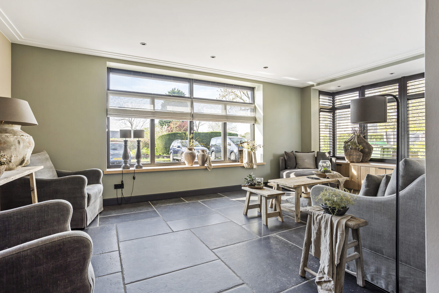 Bij binnenkomst valt direct de strakke afwerking op. De hal met trapopgang, meterkast en praktische trapkast geeft toegang tot de sfeervolle woonkamer aan de voorzijde, voorzien van een karakteristieke erker. De gehele begane grond is afgewerkt met strak stucwerk op wanden en plafonds en voorzien van vloerverwarming. In het woongedeelte liggen keramische tegels met een natuursteen uitstraling, terwijl de hal en overgang naar de woonkeuken zijn afgewerkt met klinkers, wat zorgt voor een speels en warm geheel.