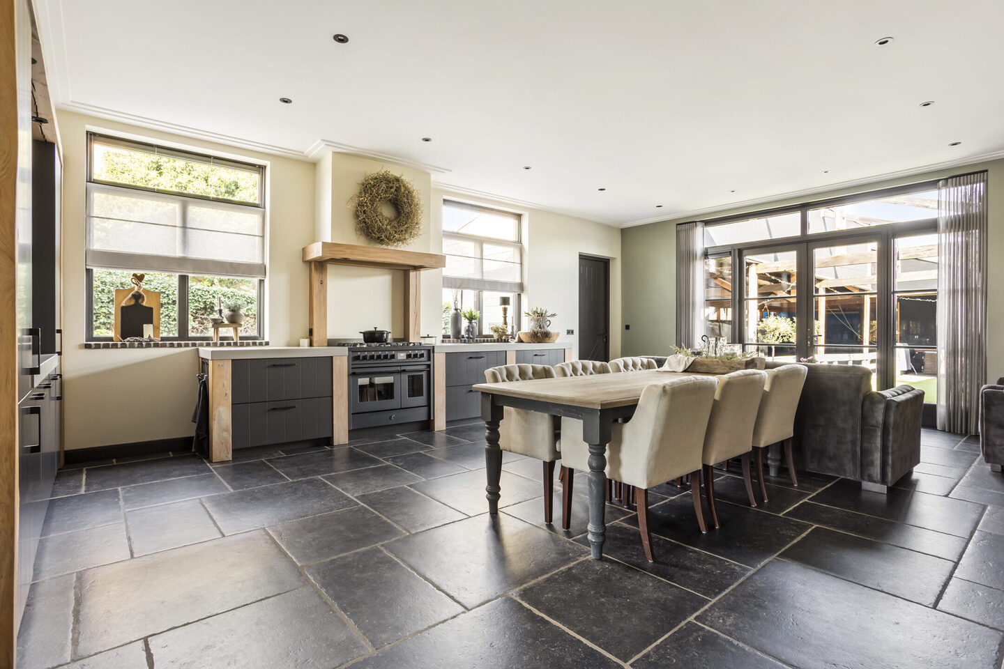 De woonkeuken aan de achterzijde is ruim opgezet en compleet uitgevoerd met onder andere een koelkast, vriezer, vaatwasser, Quooker en een robuust fornuis met twee ovens en zes gaspitten. Het composiet werkblad maakt het geheel af. Via dubbele deuren is er toegang tot de tuin, waardoor binnen en buiten mooi in elkaar overlopen.