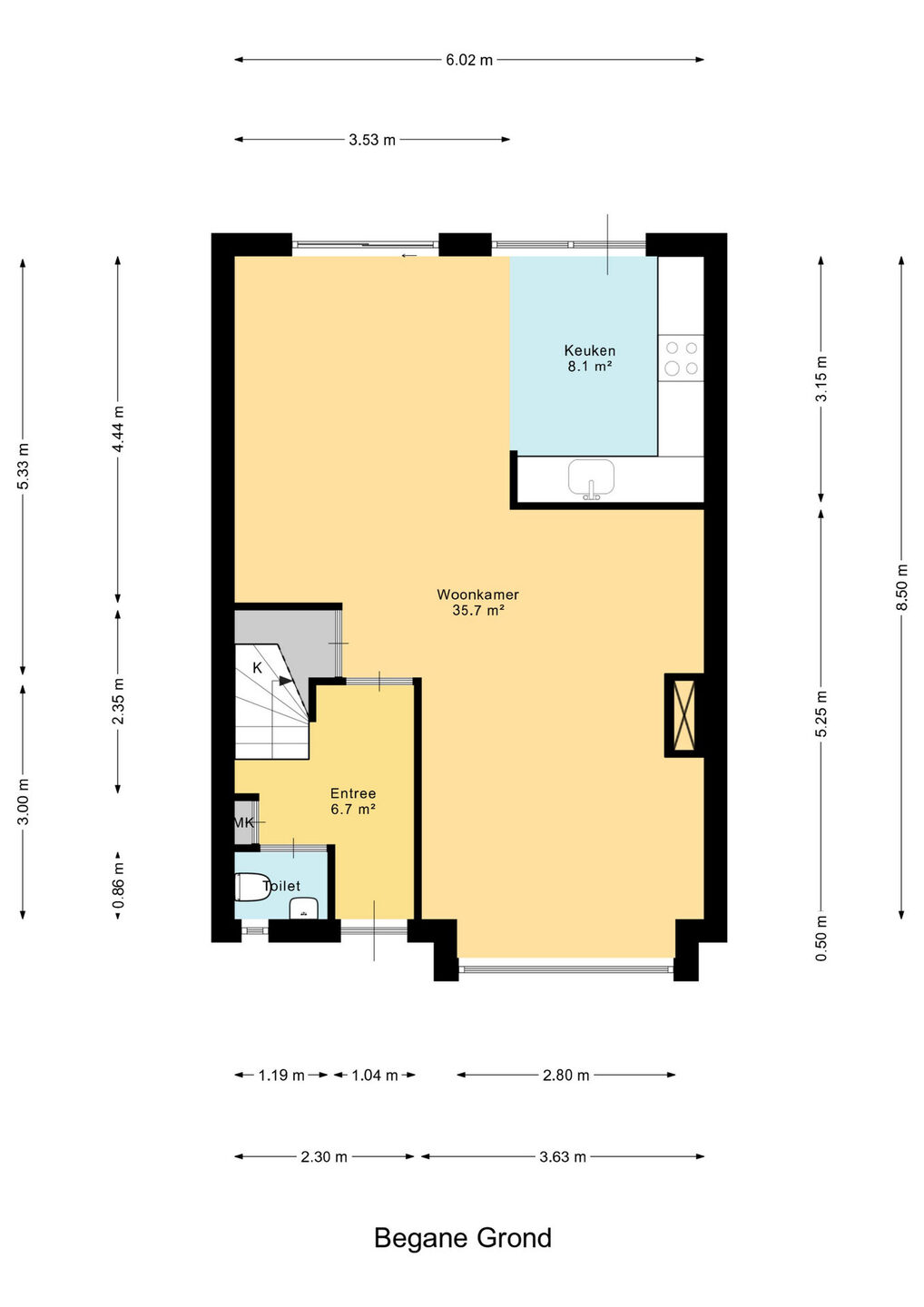 Je komt binnen in de entree, waar zich het toilet en de meterkast bevindt. Middels een deur kom je in de woonkamer terecht. De woonkamer bevindt zich aan de voorzijde van de woning en is voorzien van een sfeervolle open haard en een grote raampartij. De open keuken bevindt zich aan de achterzijde van de woning. Aan de achterzijde is zowel een aluminium schuifpui als een aparte kunststof deur. De open keuken is voorzien van een koelkast, een vaatwasser, een gaskookplaat met afzuigkap en een dubbele spoelbak.