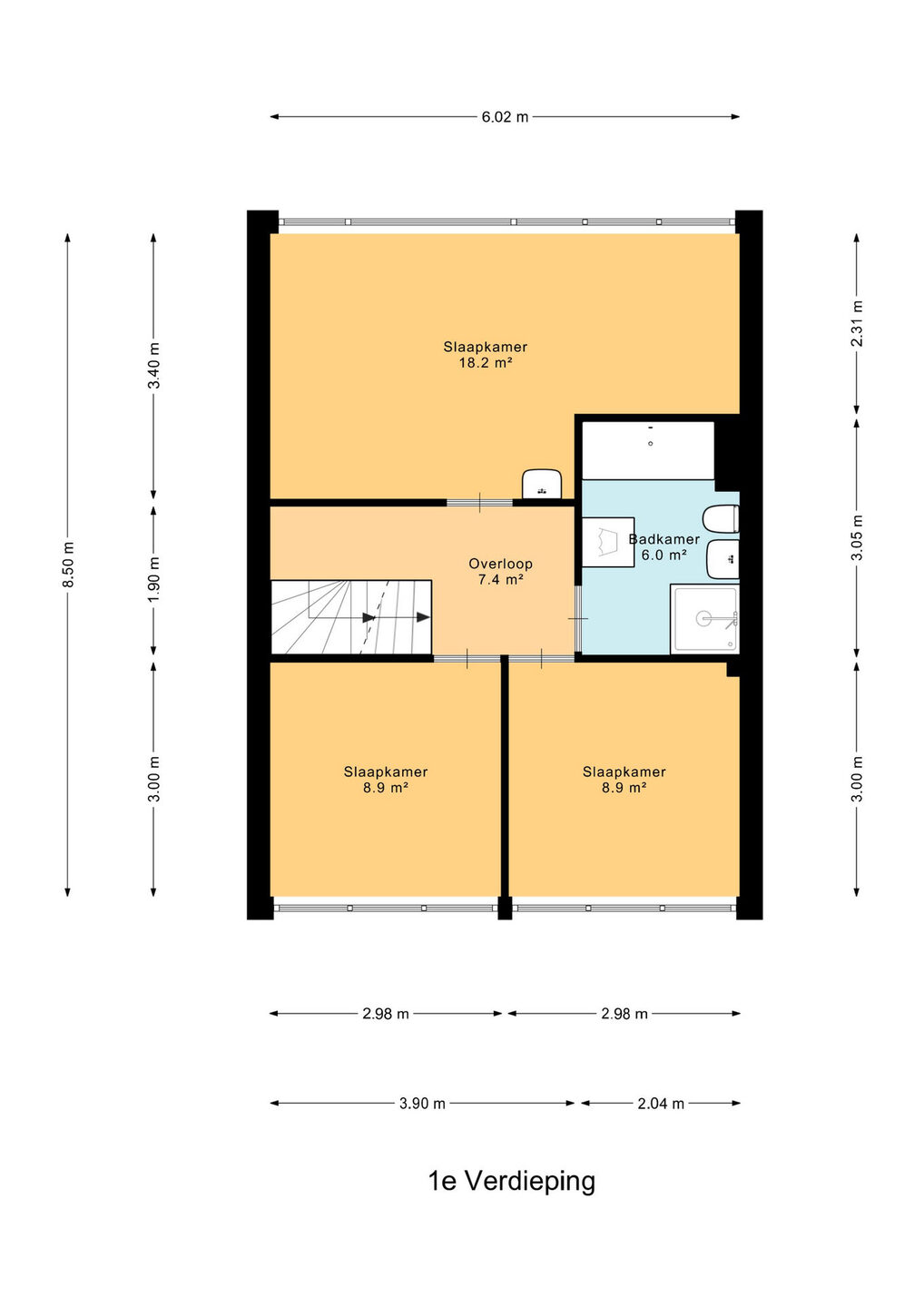 De overloop geeft toegang tot meerdere vertrekken. De grootste slaapkamer ligt aan de achterzijde en is gelegen over de volledige breedte van de woning. Ook in deze slaapkamer is er airconditioning geinstalleerd in 2019. Bovendien is er een wastafel. Aan de voorzijde van de woning liggen twee slaapkamers. De gehele verdieping is voorzien van kunststof kozijnen. De badkamer is gelegen in het midden van de verdieping en is voorzien van een ligbad, een toilet, een wastafel, een douche en de wasmachineaansluiting.