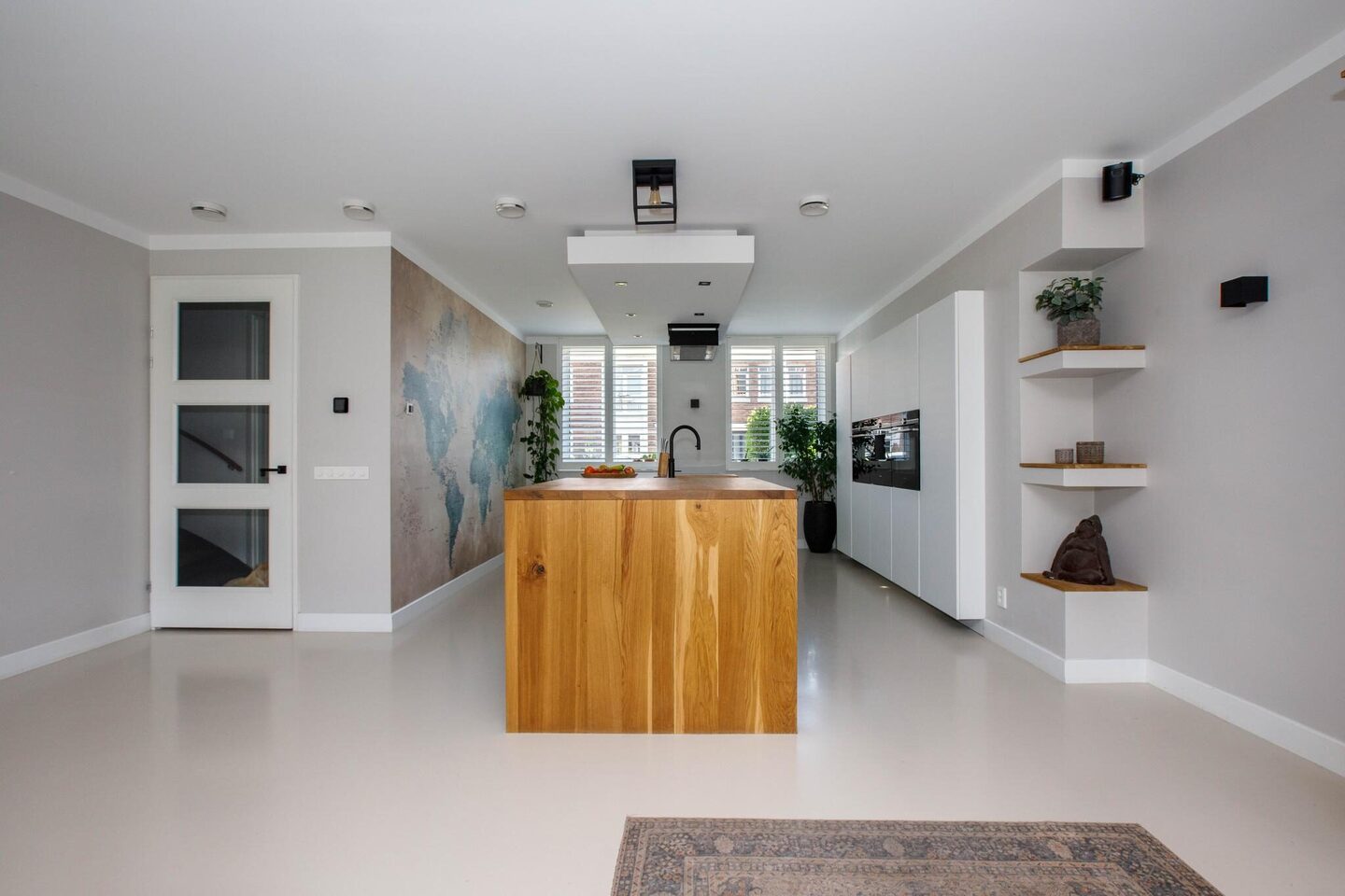 Aan de voorzijde van de woning bevindt zich de ruime en luxe open woonkeuken. Het royale kookeiland (ca. 1,5 x 3 meter) biedt naast veel werkruimte ook een gezellige bar met zitplaatsen voor vier personen. De keuken is voorzien van hoogwaardige inbouwapparatuur, waaronder een inductiekookplaat, afzuigkap, Quooker, vaatwasser, koelkast, vriezer, stoomoven, koffiemachine en combi-oven/magnetron.