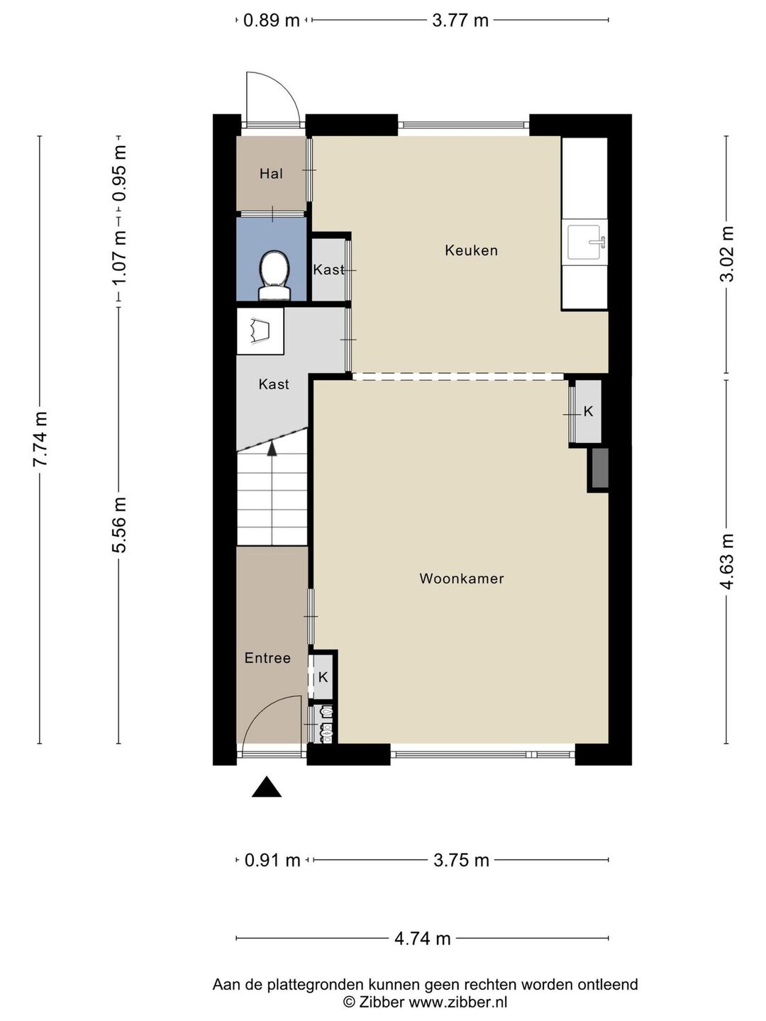 Entree met toegang tot de trap naar de eerste verdieping en de deur richting de woonkamer. Via de woonkamer heeft u toegang tot de keuken. Hier heeft u ook toegang tot een kast die zich onder de trap zit hier zit ook de aansluiting voor een wasmachine. Aan de achter zijde van de woning is het toilet gelegen. Hier bevindt zich tevens de deur naar de achtertuin. Aan de achterzijde van de woning is een erg grote tuin gelegen die zich op het zuidoosten bevindt. In de tuin is een stenen berging te vinden en een houten overkapping. De tuin is ook te bereiken via de zijkant.