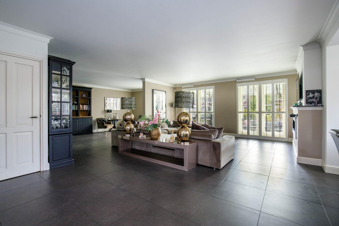 Via een mooie glazen deur kom je in de riante woonkamer, die zich kenmerkt door veel lichtinval dankzij de grote ramen en de ruime erker aan de zijkant van de woning. Onder de trap bevindt zich een praktische trapkast. De woonkamer is voorzien van een strakke tegelvloer met vloerverwarming en dubbele openslaande deuren aan de achterzijde, die toegang geven tot de tuin. Deze ruimte is ideaal voor lange, gezellige avonden aan de eettafel.
