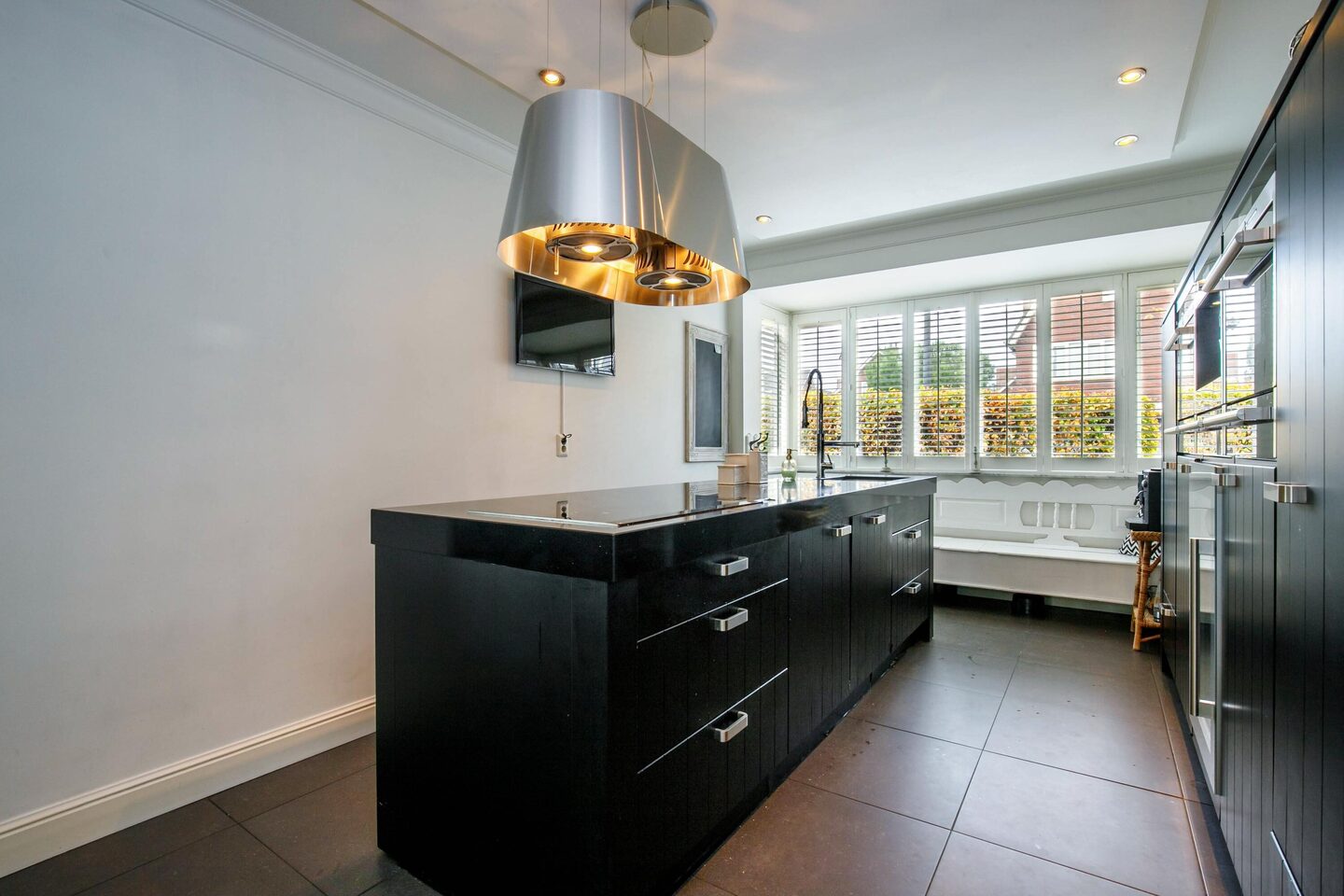 Aan de voorzijde van de woning bevindt zich de moderne open keuken met een kookeiland. De keuken is van alle gemakken voorzien, waaronder een inductiekookplaat, spoelbak, vaatwasser, drie warmhoudlades, koelkast, vriezer, wijnklimaatkast, stoomoven, combi-oven en een geïntegreerde koffiemachine. Bovendien biedt de keuken volop opbergruimte.