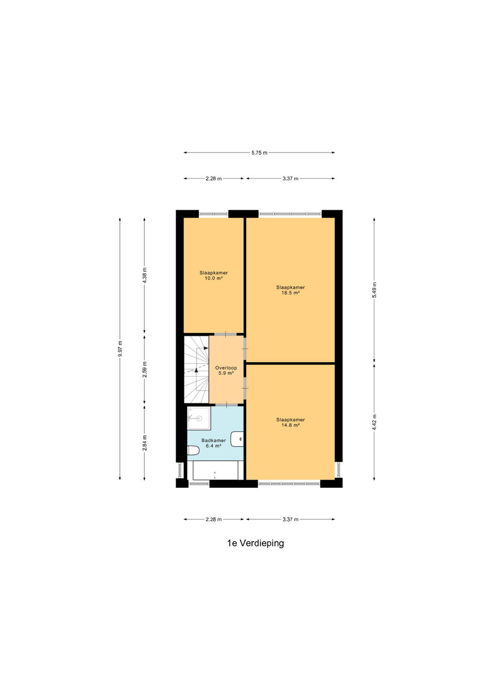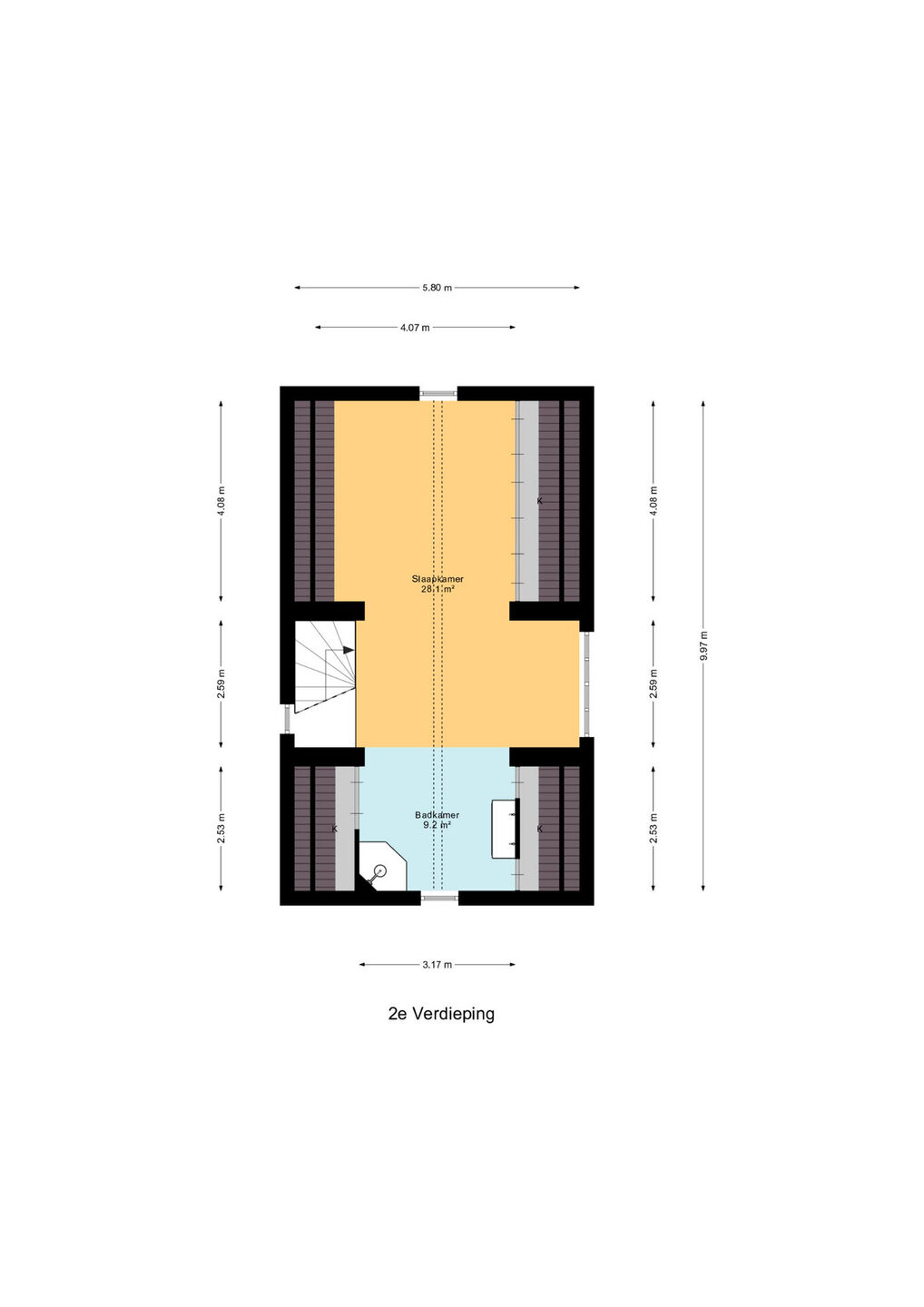 De tweede verdieping is met recht een parel te noemen, door de hoge nok is deze verdieping ruimtelijk en licht. De open ruimte wordt optimaal verlicht door twee dakramen en is voorzien van een nette inbouwkast en airconditioning. De badkamer is strak uitgevoerd met een dubbele wastafel, radiator en een douche met stoomfunctie. Een moderne, comfortabele verdieping die direct klaar is voor gebruik.