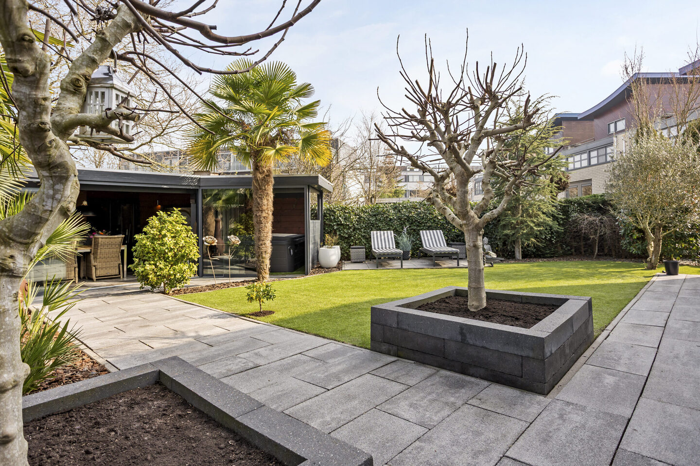 De tuin is gelegen op het oosten en is werkelijk een heerlijke plek om te ontspannen. De tuin is ruim en fraai aangelegd en voorzien van kunstgras, waardoor het onderhoud beperkt blijft. Achter in de tuin bevindt zich een grote overkapping met daarachter een berging. Deze overkapping is helemaal af te sluiten met glazen wanden en voorzien van heaters. Ernaast is een aparte ruimte voor de jacuzzi. Een perfecte plek voor lange zomeravonden of gezellige momenten met familie en vrienden.
