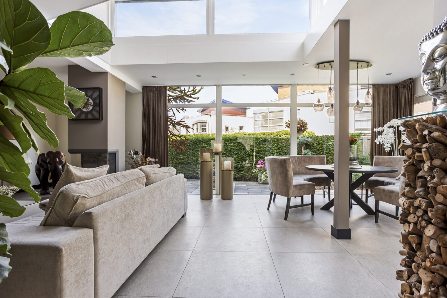 De woonkamer is werkelijk een fantastische ruimte. Door de grote open vide en de hoge raampartijen geniet u hier van een prachtige lichtinval en een ruimtelijk gevoel. Het zitgedeelte is sfeervol ingericht en beschikt over een gashaard, wat zorgt voor een warme en gezellige sfeer tijdens de koudere maanden. Aan de andere zijde van de woonkamer, aan de kant van de tuin, is een tweede zitgedeelte gecreëerd, met schuifdeuren naar de tuin, waardoor binnen en buiten op mooie dagen naadloos in elkaar overlopen.
