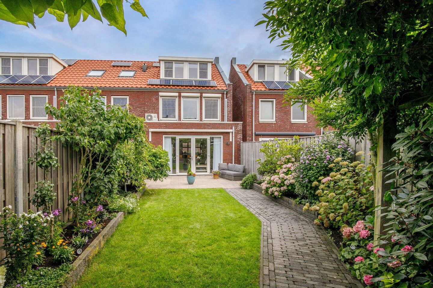 Via de openslaande deuren loop je zo de zonnige en diepe achtertuin in, gelegen op het zuiden. Hierdoor is er altijd wel een plekje in de zon vinden! Hier vind je een houten berging, achterom en een elektrisch bedienbaar zonnescherm.