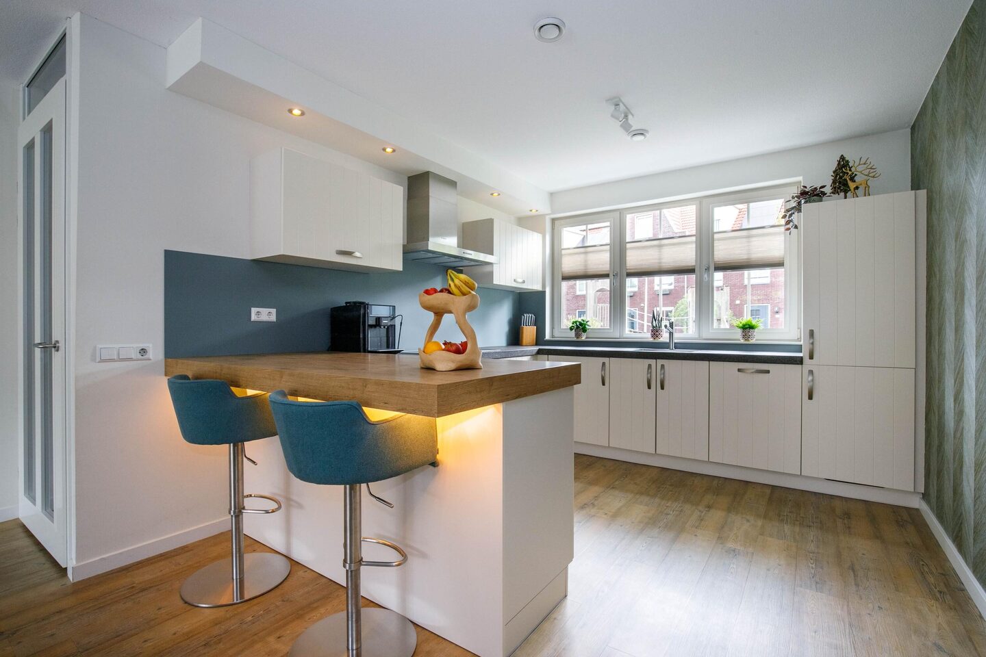 De modern landelijke, open keuken is voorzien van een leuk barretje en beschikt over diverse inbouwapparatuur zoals een oven, inductiekookplaat, koelkast, vriezer en vaatwasser.
