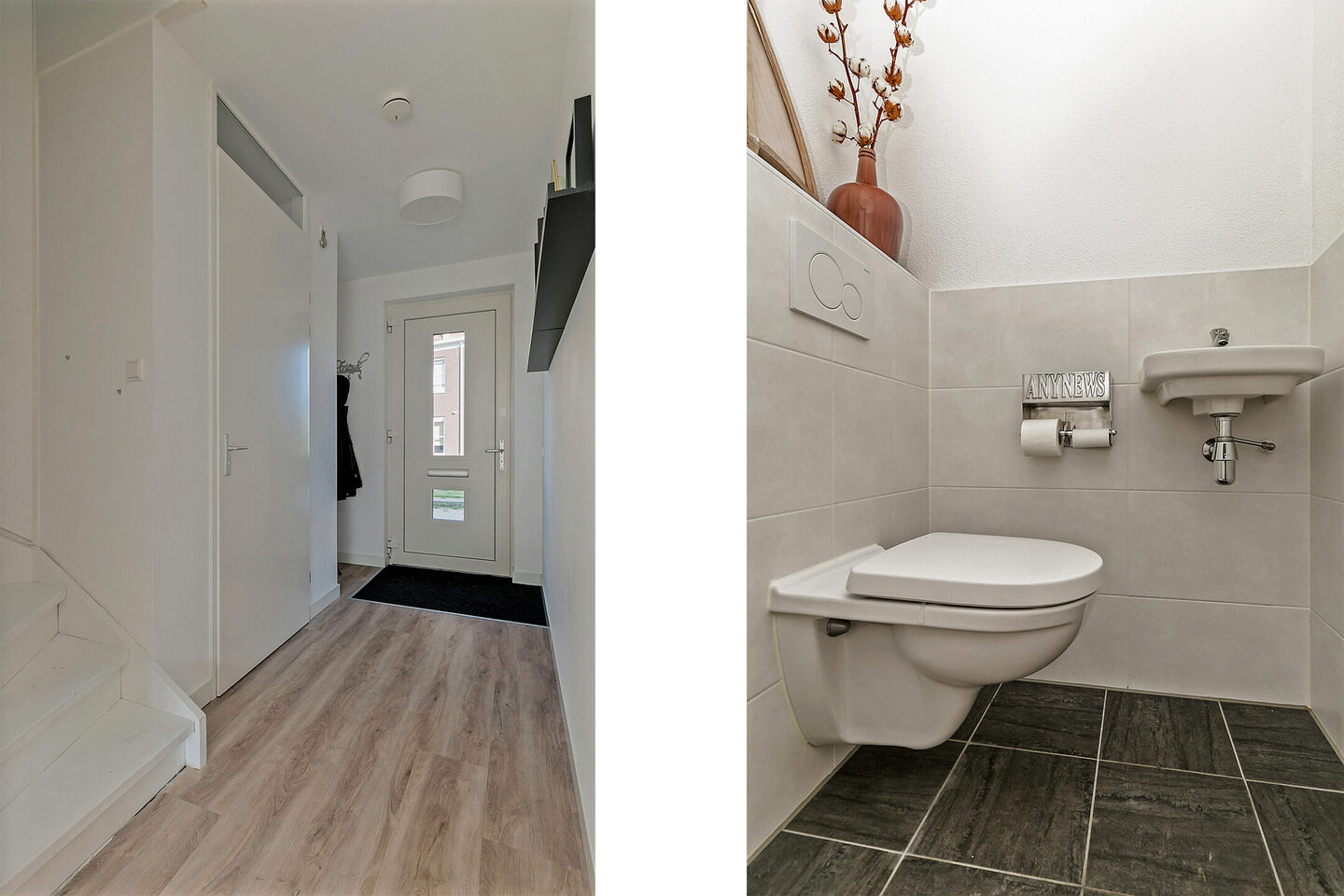 Entree, hal met de meterkast, toilet, trapopgang naar de eerste verdieping.