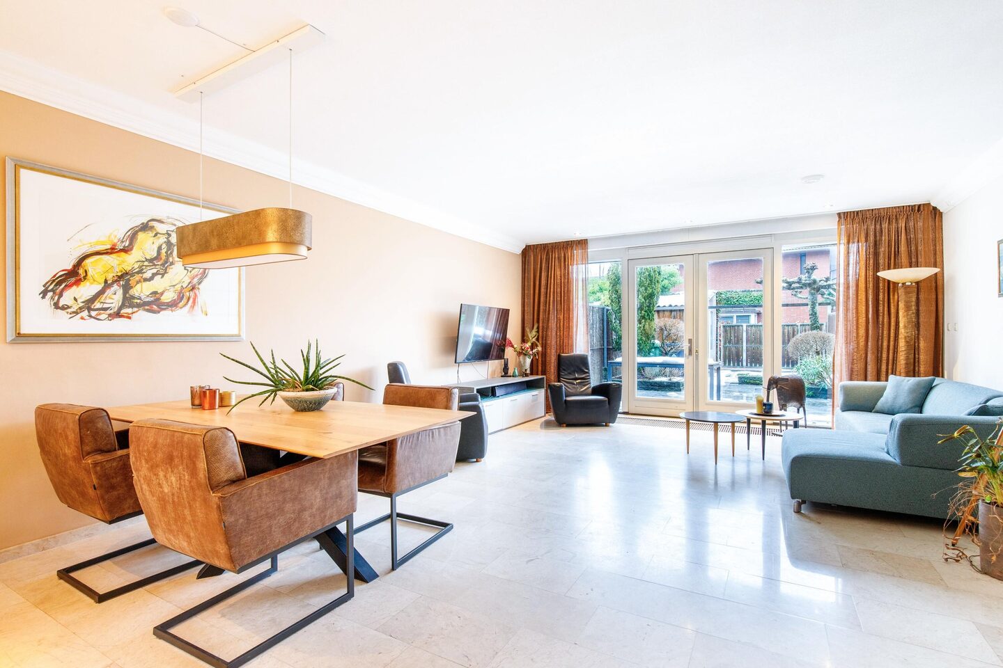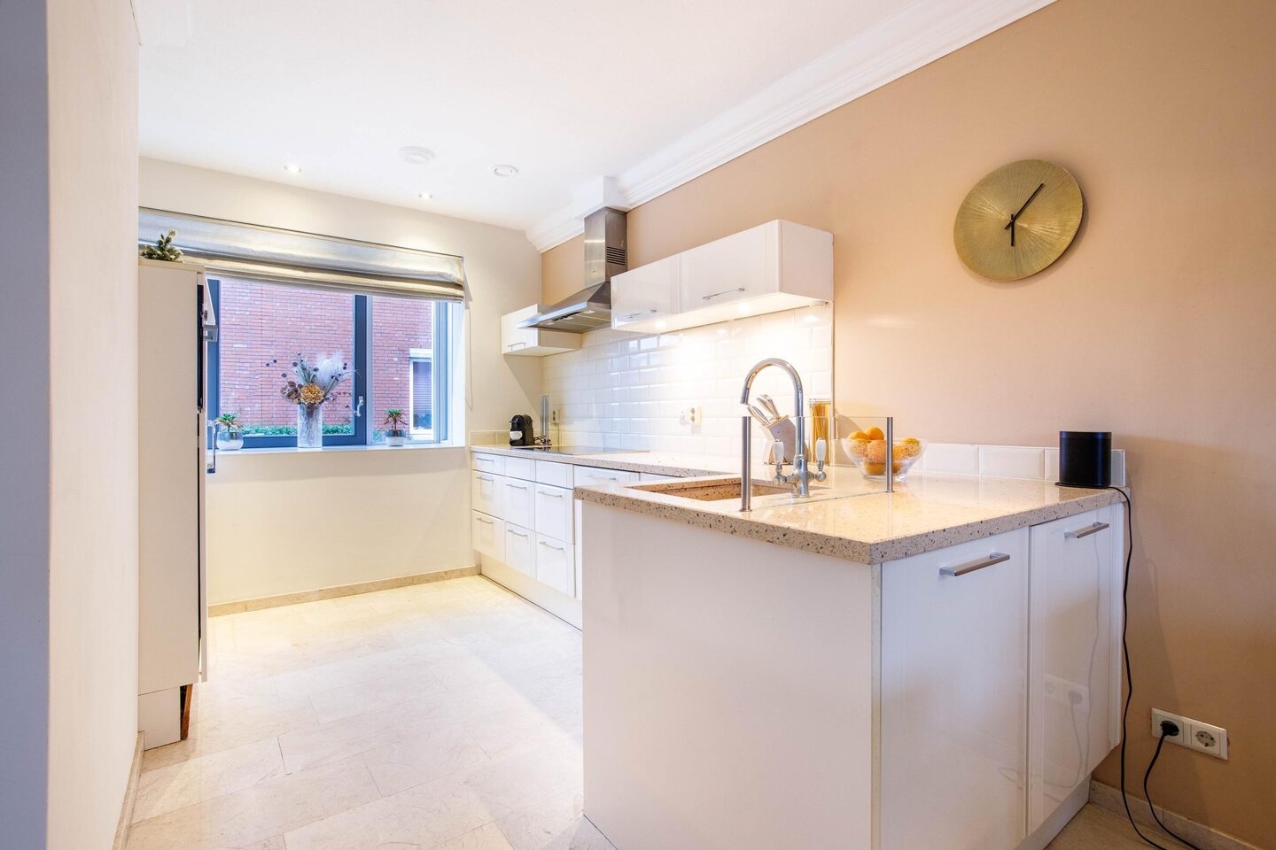 Vanuit de hal heeft u toegang tot de uitgebouwde woonkamer welke beschikt over een trapkast. Aan de voorzijde ligt de open keuken. De keuken beschikt over een 4-pits keramische kookplaat, een afzuigkap, een vaatwasser, een koelkast, een vriezer en een combi-oven. De begane grond is voorzien van een marmeren vloer met vloerverwarming.