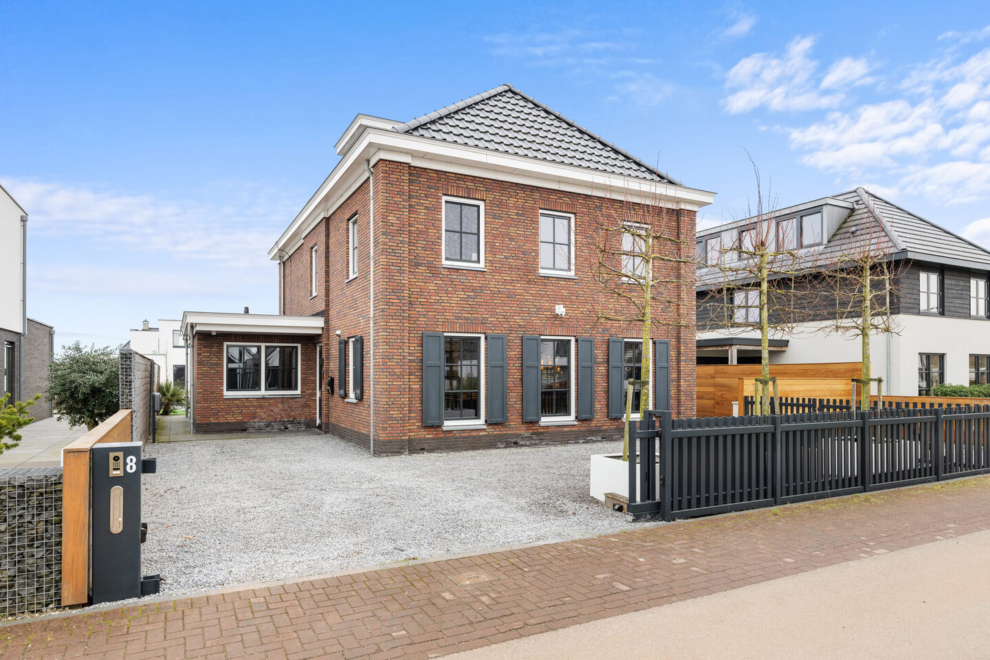 Afgesloten terrein door middel van elektrische poort. Parkeren op eigen terrein, voorzien van laadpaal.