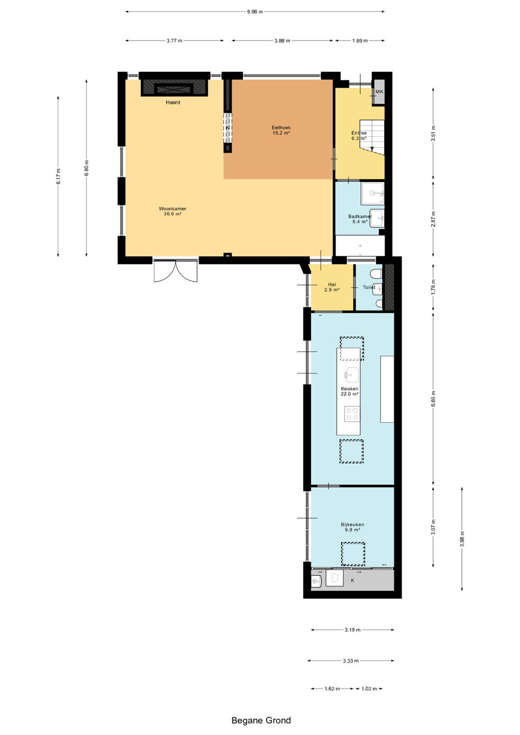 Tussen de woonkamer en de aangebouwde keuken bevindt zich een hal met daarin het toilet (met wandcloset, fonteintje en urinoir) en een deur naar de tuin.