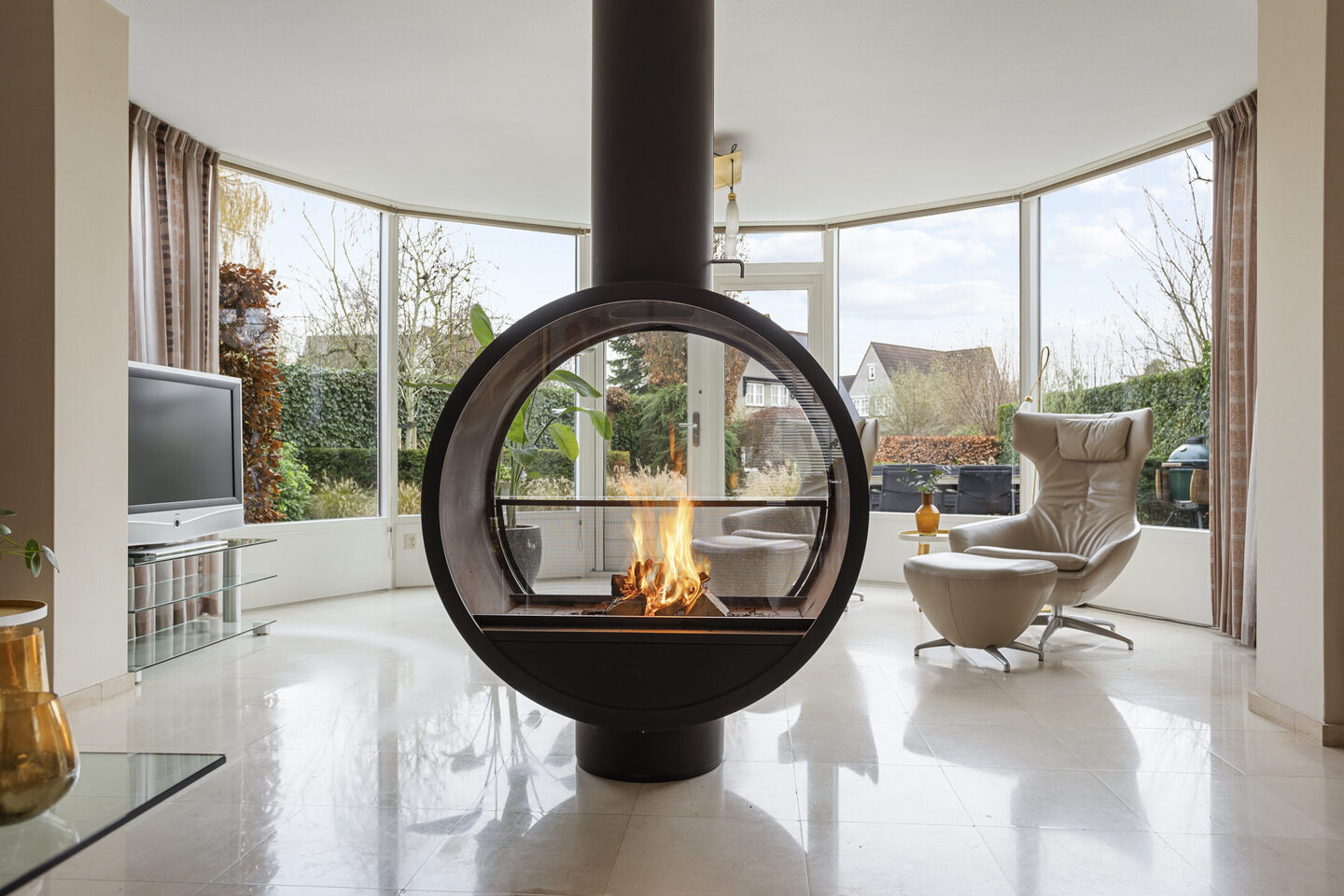 De woonkamer is royaal en licht, mede dankzij de half ronde aanbouw met dubbele deuren naar de tuin. De draaibare houtgestookte open haard is een echte blikvanger en zorgt voor extra sfeer. Aan de voorzijde bevindt zich de open keuken, die vier jaar geleden is geplaatst. De keuken is uitgerust met Siemens Studioline inbouwapparatuur, waaronder een vaatwasser, koelkast, Quooker, inductiekookplaat met afzuiging, oven en combioven. Het composieten werkblad heeft een Belgisch hardsteen look.